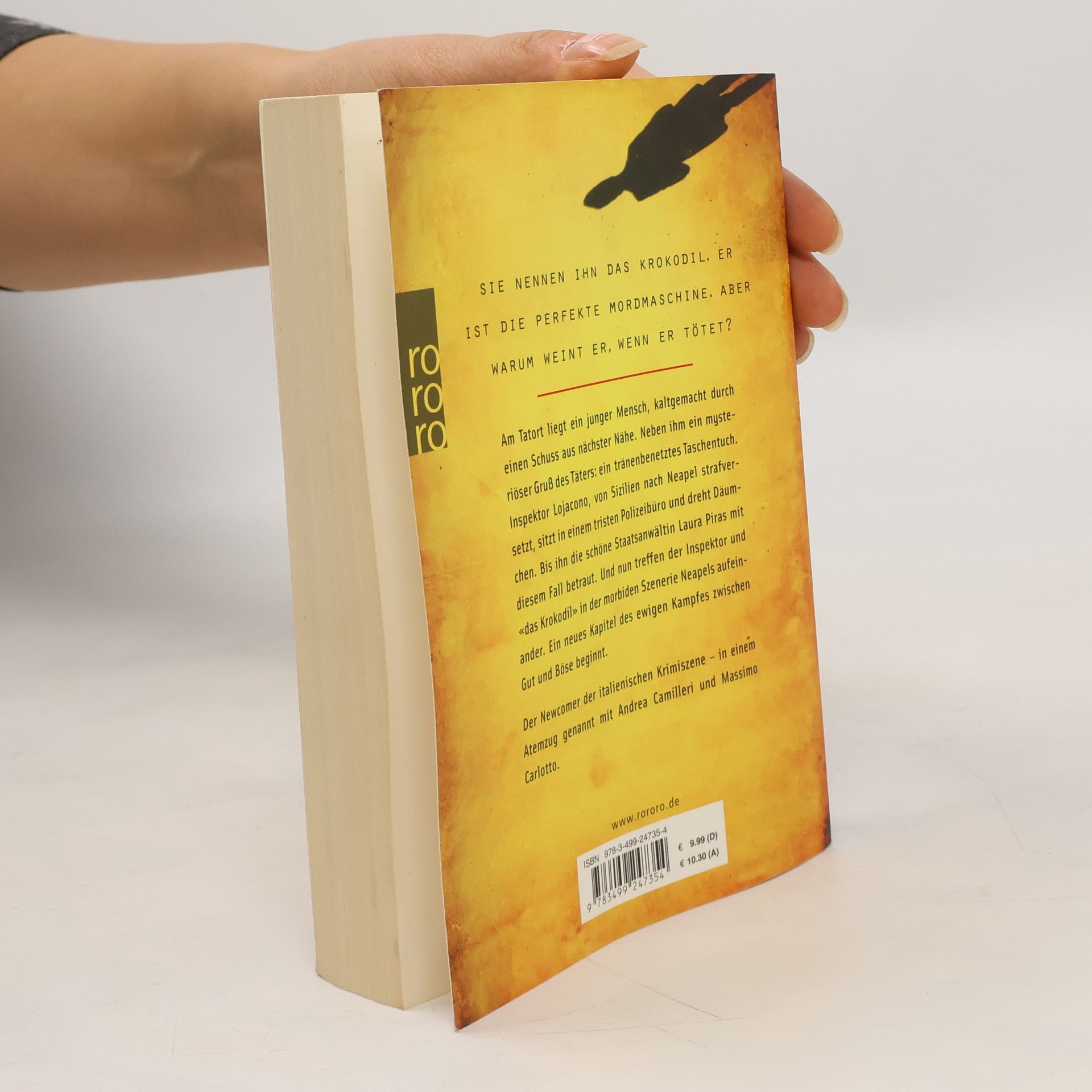 Sie nennen ihn das Krokodil. Er ist die perfekte Mordmaschine. Aber warum weint er, wenn er tötet? Am Tatort liegt ein junger Mensch, kaltgemacht durch einen Schuss aus nächster Nähe. Neben ihm ein mysteriöser Gruß des Täters : ein tränenbenetztes Taschentuch. Inspektor Lojacono, von Sizilien nach Neapel strafversetzt, sitzt in einem tristen Polizeibüro und dreht Däumchen. Bis ihn die schöne Staatsanwältin Laura Piras mit diesem Fall betraut. Und nun treffen der Inspektor und «das Krokodil» in der morbiden Szenerie Neapels aufeinander. Ein neues Kapitel des ewigen Kampfes zwischen Gut und Böse beginnt. Der Newcomer der italienischen Krimiszene – in einem Atemzug genannt mit Andrea Camilleri und Massimo Carlotto.