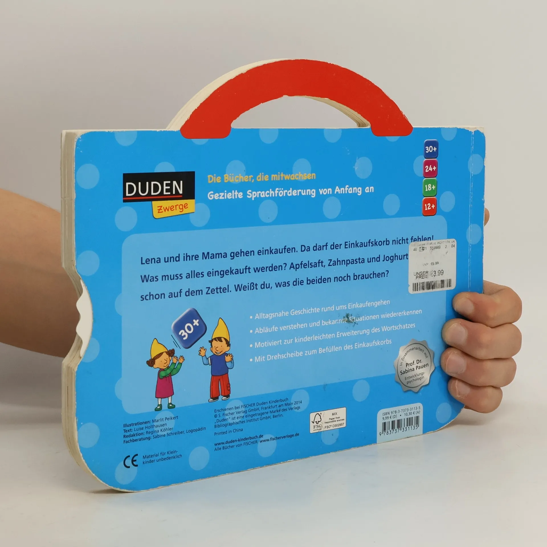 Der erste Einkaufskorb zum Blättern! Mit alltagsnaher und altersgerechten Geschichte können Kindern ab 30 Monaten im Buch einkaufen gehen und so spielerisch ihren Wortschatz erweitern. Mit einer Drehscheibe kann ausgewählt werde, was im Einkaufskorb noch fehlt. Die Bücher aus der Reihe „Duden Zwerge" ab 12, 18, 24 und 30 Monaten begleiten Kinder Schritt für Schritt bei ihrer sprachlichen Entwicklung. Konzipiert in Zusammenarbeit mit Logopäden sowie der renommierten Entwicklungspsychologin Prof. Dr. Pauen. Alle Bilderbücher sind in Inhalt und Form sorgfältig auf die jeweilige Altersstufe abgestimmt und unterstützen Eltern und Erzieher bei der optimalen Förderung ihrer Kinder.