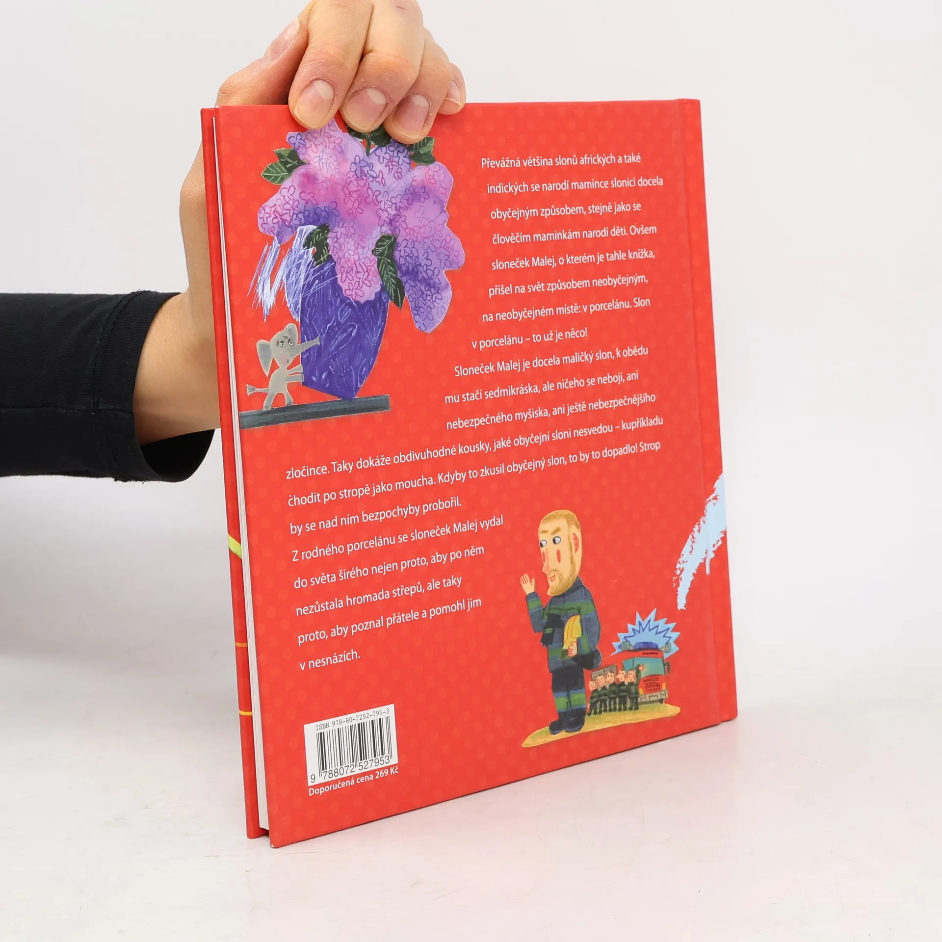 Sloneček Malej je docela maličký slon, k obědu mu stačí sedmikráska, ale ničeho se nebojí, ani nebezpečného myšiska, ani ještě nebezpečnějšího zločince. Taky dokáže obdivuhodné kousky, jaké obyčejní sloni nesvedou – ku příkladu chodit po stropě jako moucha. Kdyby to zkusil obyčejný slon, to by to dopadlo! Strop by se nad ním bezpochyby probořil. Z rodného porcelánu se sloneček Malej vydal do světa širého nejen proto, aby po něm nezůstala hromada střepů, ale taky proto, aby poznal přátele a pomohl jim v nesnázích.