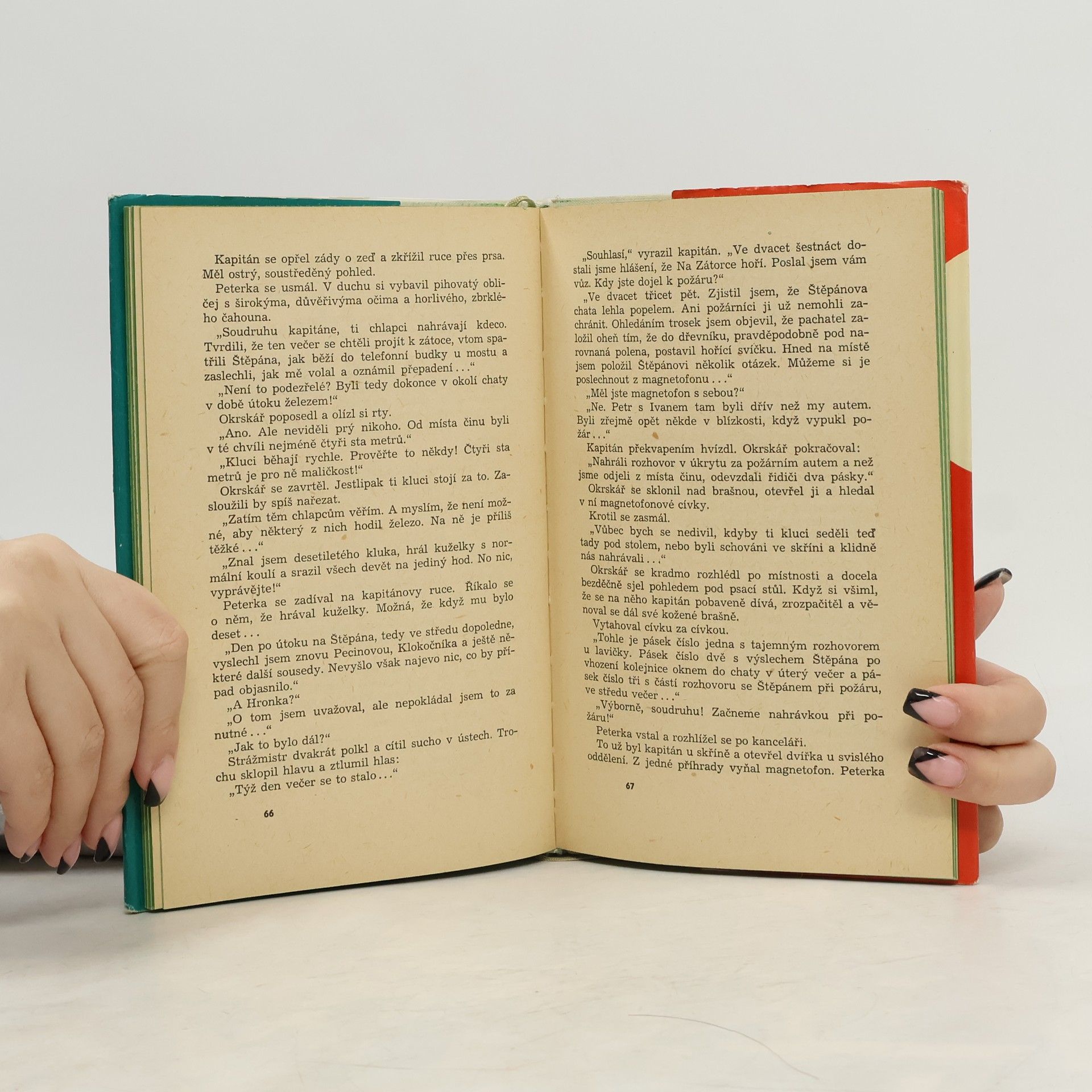 Svěží detektivka pro mládež, napsaná původně jako rozhlasová hra a po úspěchu v rozhlase přepracovaná do knižní podoby. Napínavý děj je založen na zálibě dvou školáků, nahrávat nepozorovaně rozhovory a zvuky na ulici. Příběh provázejí názorné fotografie filmového kameramana. Cenaknihy v čase vydání: 15.- Kčs.