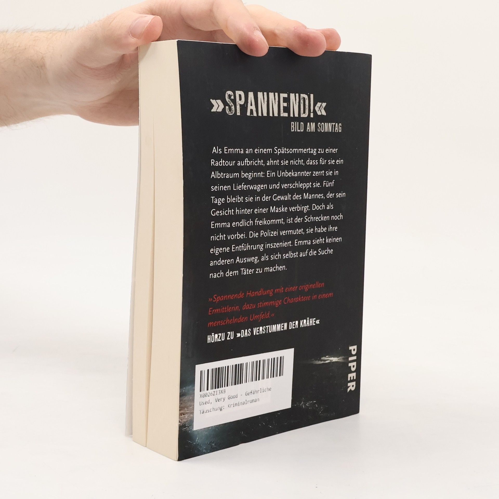 Als die Kinderbuchillustratorin Emma an einem Spätsommertag zu einer Radtour aufbricht, ahnt sie nicht, dass für sie ein Albtraum beginnt: Ein Unbekannter zerrt sie in seinen Lieferwagen und verschleppt sie. Fünf Tage bleibt sie in der Gewalt des Mannes, der sein Gesicht hinter einer Maske verbirgt. Doch als Emma endlich freikommt, ist der Schrecken noch nicht vorbei. Die Polizei vermutet, sie habe ihre eigene Entführung inszeniert. Emma sieht keinen anderen Ausweg, als sich selbst auf die Suche nach dem Täter zu machen.