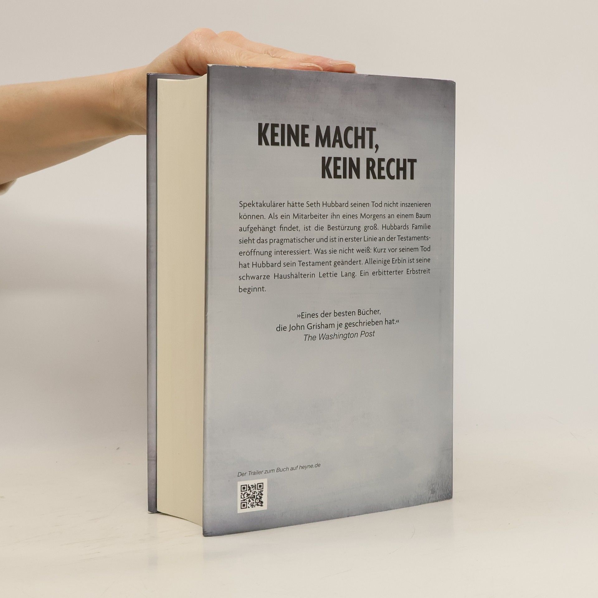 Keine Macht, kein Recht Spektakulärer hätte Seth Hubbard seinen Tod nicht inszenieren können. Als sein Mitarbeiter ihn eines Morgens aufgehängt an einem Baum findet, ist die Bestürzung im beschaulichen Clanton groß. Niemand hätte mit einem Freitod gerechnet. Hubbards Familie sieht das pragmatischer und ist in erster Linie an der Testamentseröffnung interessiert. Was sie nicht weiß: Kurz vor seinem Tod hat Hubbard sein Testament geändert. Alleinige Erbin ist seine schwarze Haushälterin Lettie Lang. Ein erbitterter Erbstreit beginnt . . .Als der schwer kranke Seth Hubbard seinem Leben ein Ende setzt, ahnt niemand, welche Folgen diese Tat haben wird. Hubbard, ein grimmiger Einzelgänger, blieb im Wesentlichen für sich. Versorgt von einer Haushälterin, hatte er kaum mehr Kontakt zu seiner Familie. Hubbards erwachsene Kinder absolvieren die Trauerfeier für ihren Vater denn auch wie einen Pflichtbesuch, um sich danach möglichst schnell der Testamentseröffnung zu widmen. Die Überraschung könnte kaum größer sein, als sich herausstellt, dass Hubbards Vermögen 24 Millionen Dollar umfasst. Den Löwenanteil spricht Hubbard seiner Haushälterin Lettie Lang zu. Seine Familie indes geht leer aus. In Windeseile fechten Hubbards Kinder das Testament an. Mit allen Mitteln versuchen sie Hubbards Unzurechnungsfähigkeit zu beweisen. Die Rechnung scheint aufzugehen. Bis Jack Brigance, der Anwalt an Lettie Langs Seite, Hubbards verschwundenen Bruder Ancil ausfindig macht, der eine Geschichte zu berichten hat, die einem das Blut in den Adern gefrieren lässt. Plötzlich ergibt Seth Hubbards Testament auf tragische Weise Sinn.