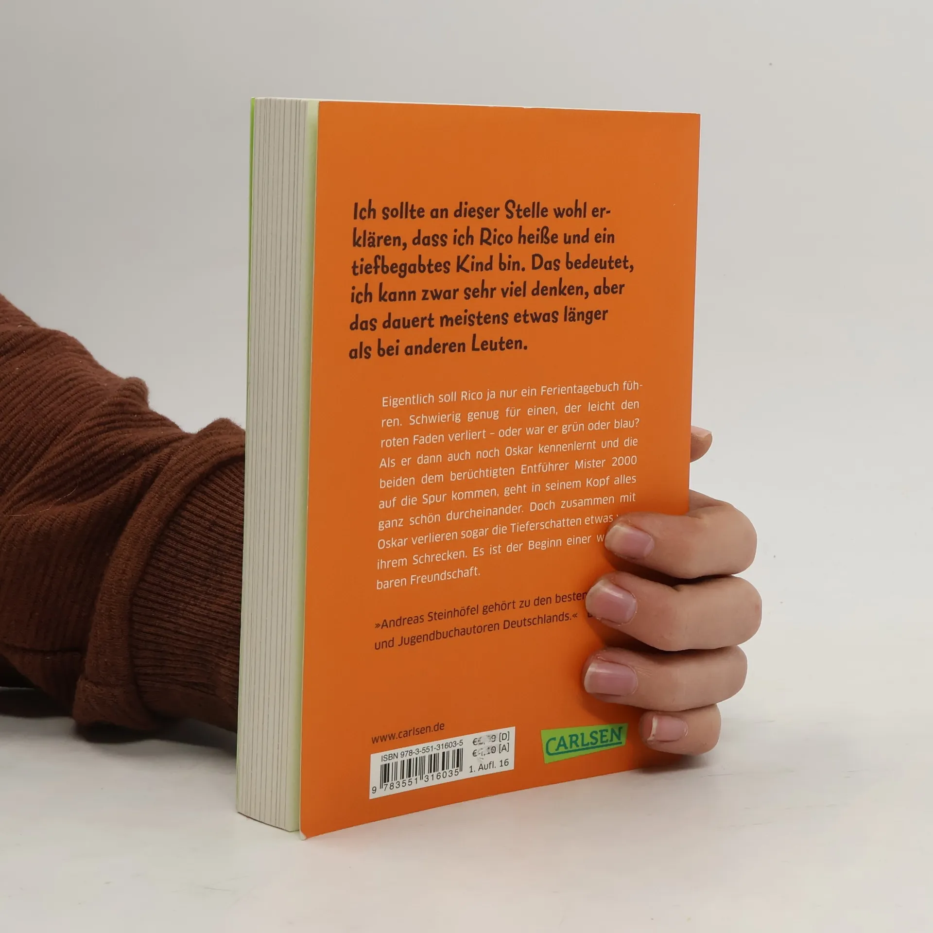 Eigentlich soll Rico ja nur ein Ferientagebuch führen. Schwierig genug für einen, der leicht den roten oder den grünen oder auch den blauen Faden verliert. Aber als er dann auch noch Oskar mit dem blauen Helm kennenlernt und die beiden dem berüchtigten ALDI-Kidnapper auf die Spur kommen, geht es in seinem Kopf ganz schön durcheinander. Doch zusammen mit Oskar verlieren sogar die Tieferschatten etwas von ihrem Schrecken. Es ist der Beginn einer wunderbaren Freundschaft.