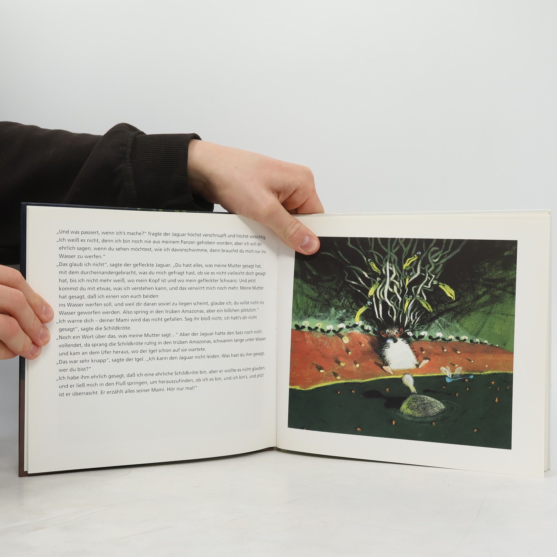 Die Geschichte, wie Igel und Schildkröte sich nicht vom Jaguar fressen lassen wollten und sich den Panzer der Gürteltiere zulegten.