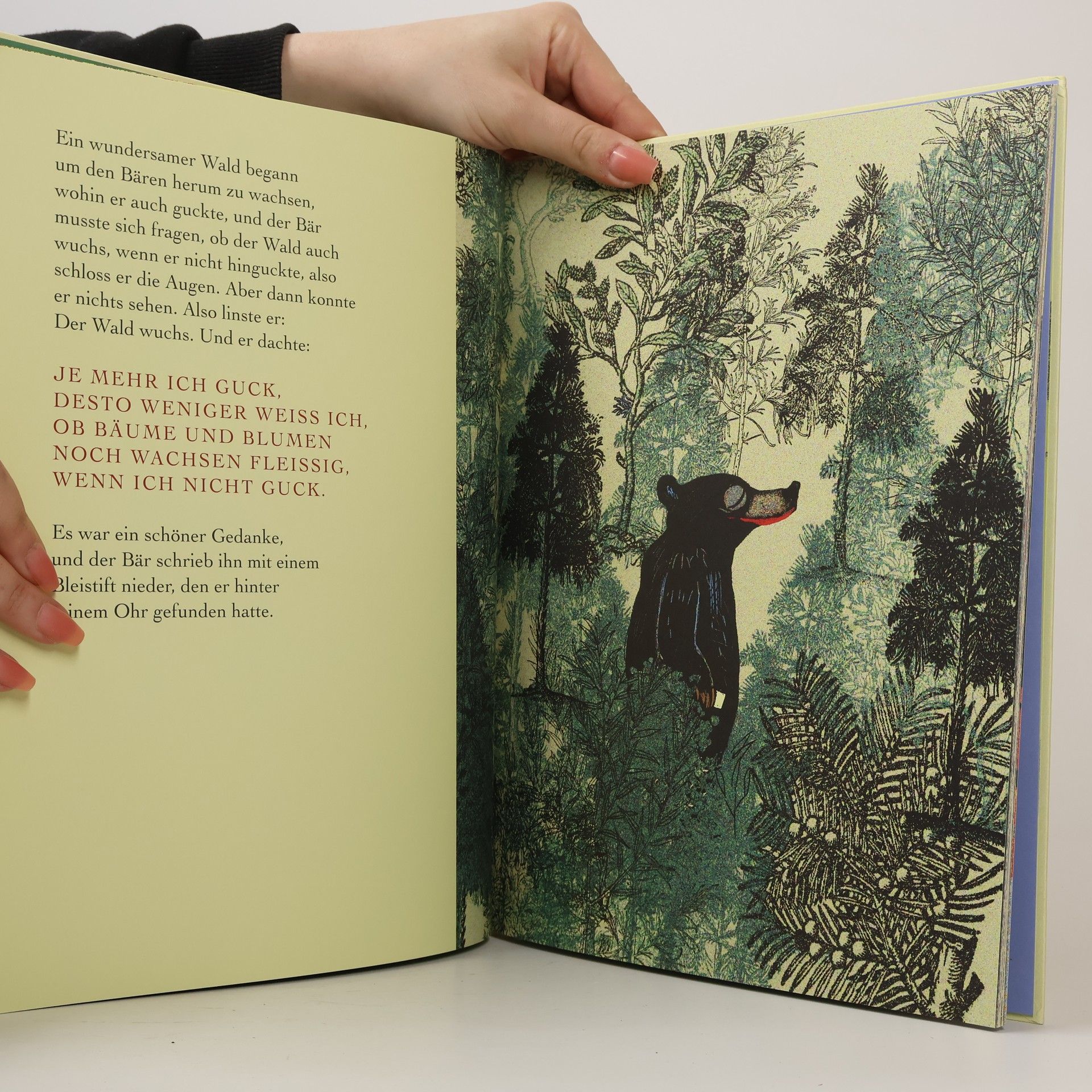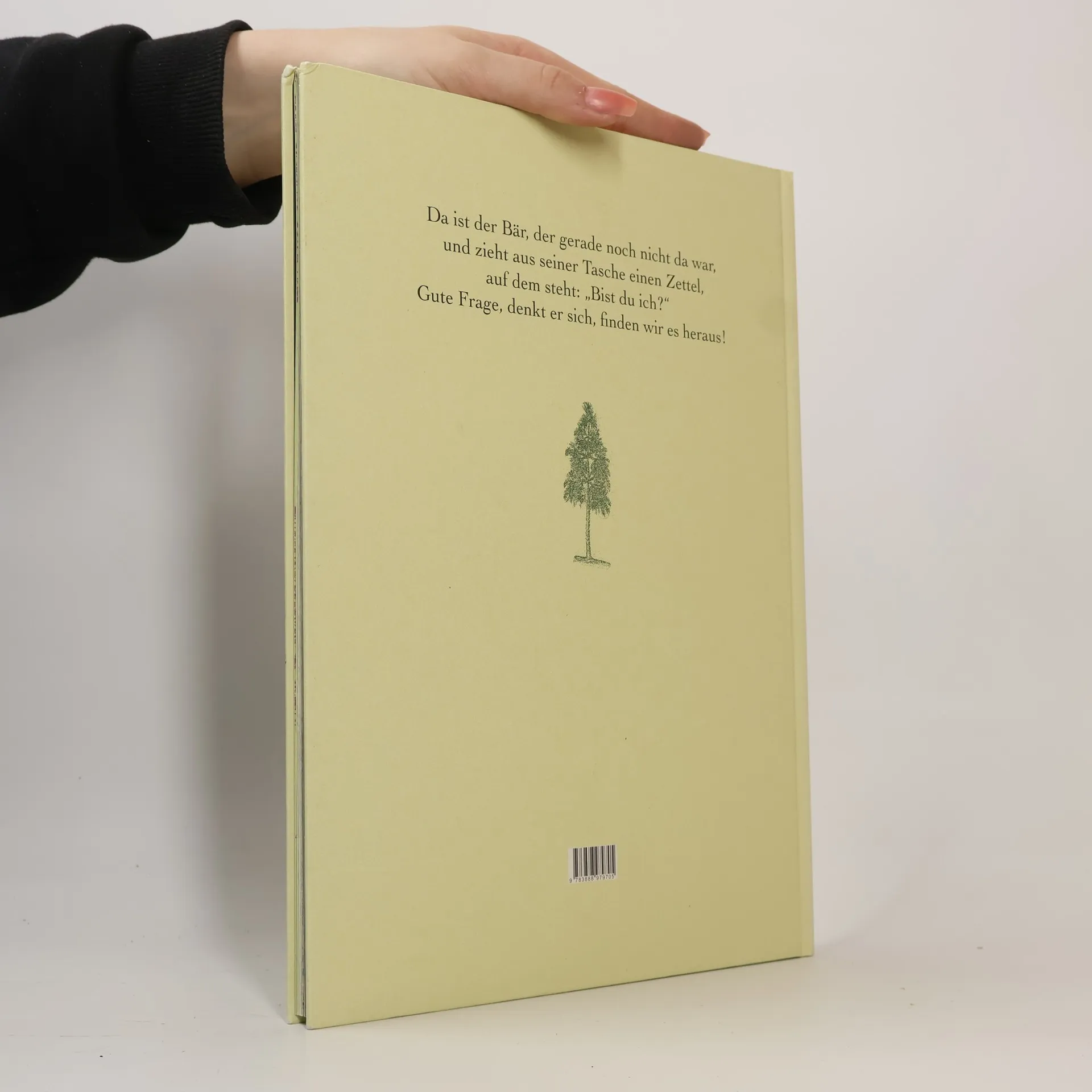 Da ist er, der Bär, der gerade noch nicht da war, und zieht aus seiner Tasche einen Zettel, auf dem steht: „Bist du ich?“ Gute Frage, denkt er sich, finden wir es heraus! Sofort macht er sich auf und wandert in den wundersamen Wald. Dort trifft er das Bequeme Bergrind und den Saumseligen Salamander, die ihm versichern, er sei ein sehr netter Bär! Glücklich wandert er weiter. Bis zum Kompass-Baum. Von da aus geht es in acht Richtungen: Norden, Süden, Osten, Westen, Falsch, Richtig, Mittagessen und Frühstück. Welche sollte er einschlagen: Frühstück? Mittagessen? Und wäre nicht das Träge-Schildkröten-Taxi gekommen, würde der Bär immer noch überlegen. Wir aber wissen jetzt schon: Dieser Bär ist sehr nett, und er ist glücklich. Er könnte ein entfernter Verwandter von „Pu, der Bär“ sein, so wie er auf die Welt schaut. Und weil jeder gerne wissen will, wer er ist, werden Kinder und Erwachsene diesen Bären und diese zauberhafte, philosophische Geschichte mit den unvergesslichen Bildern von Wolf Erlbruch lieben.