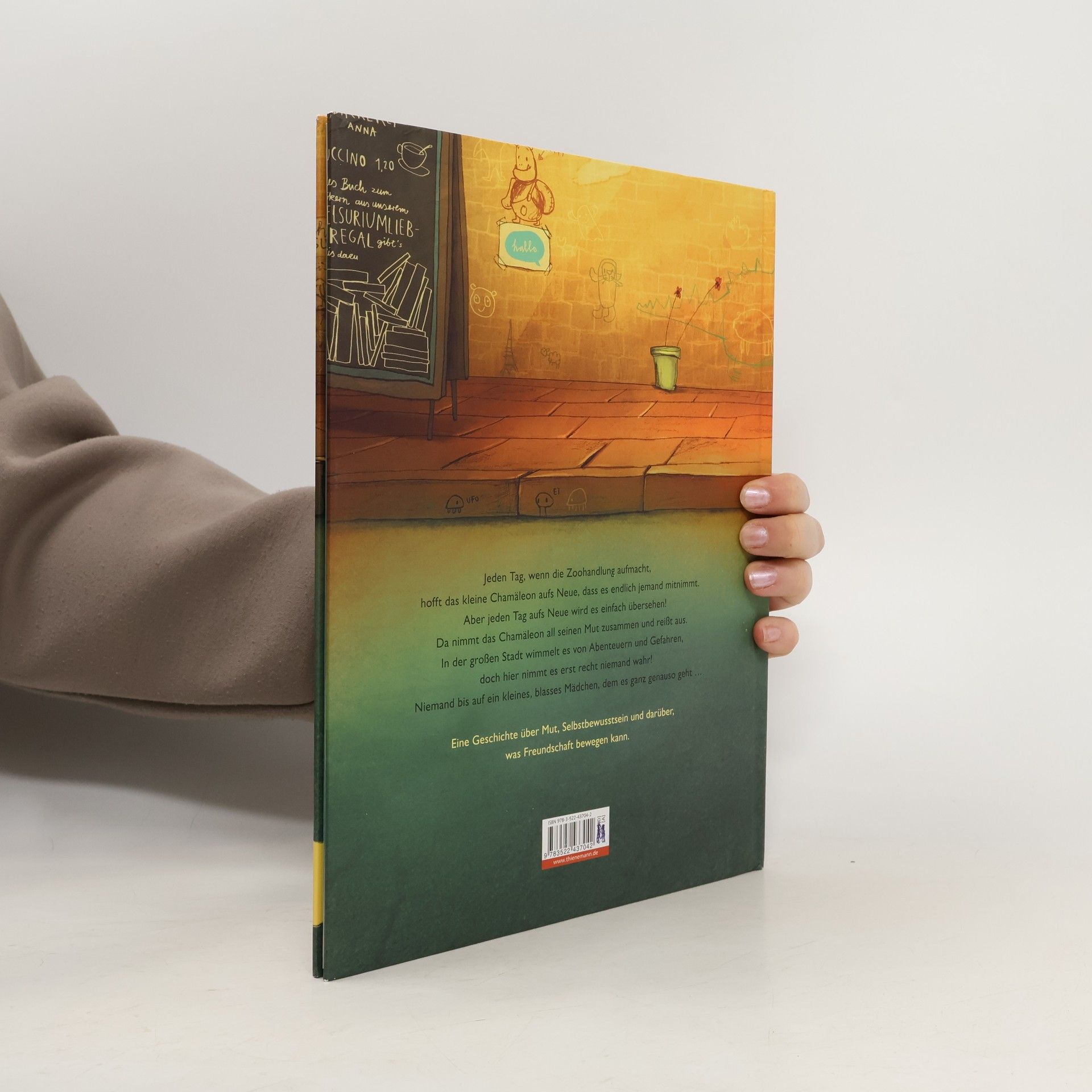 In einer Zoohandlung in einem Terrarium lebt ein kleines Chamäleon und wartet darauf, einen Besitzer zu finden. „Hallo, ich bin auch noch da!“, ruft es. Aber keiner beachtet es. Da nimmt es eines Tages all seinen Mut zusammen und reißt aus. In der Menschenwelt jedoch nimmt auch niemand das kleine Tier wahr. Bis dem dem Chamäleon endlich ein kleines Mädchen begegnet, dem es genauso geht wie ihm. Eine Geschichte über Mut und Selbstbewusstsein. Und darüber, was Freundschaft bewegen kann.