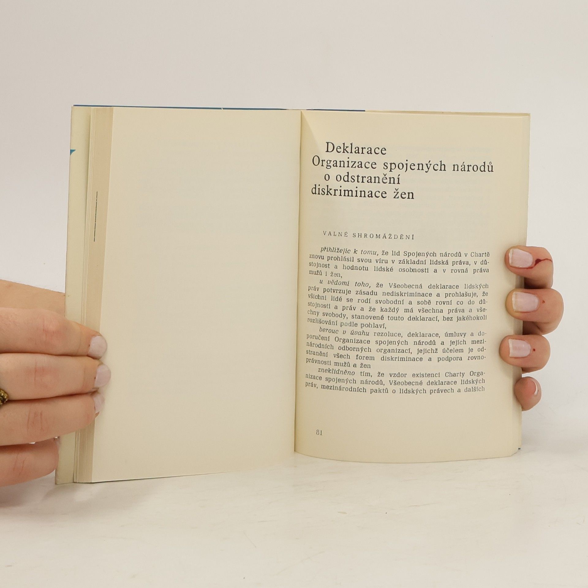 Publikace obsahuje 11 v té době zásadních lidskoprávních dokumentů: 1. Všeobecná deklarace lidských práv, 2. Medzinárodní pakt o hospodářských, sociálních a kulturních právech, 3. Medzinárodní pakt o občanských a politických právech, 4. Fakultativní protokol k Medzinárodnímu paktuo občanských a politických právech, 5. Úmluva o politických právech žen, 6. Deklaraca o výchově mládeže v duchu ideálů míru, vzájemné úcty a porozumění mezi národy, 7. Deklarace práv dětí, 8. Mezinárodní úmluva o odstranění všech forem rasové diskriminace, 9. Deklarace OSN o odstranění diskriminace žen, 10. Úmluva o boji proti diskriminaci v oblasti vzdělávání, 11. Prohlášení teheránské konference.