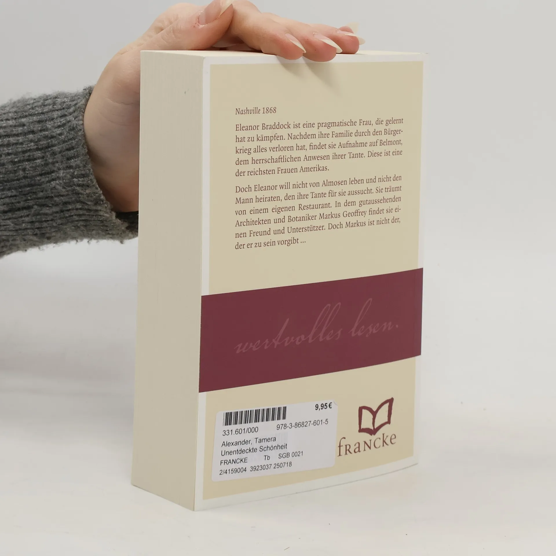 Nashville 1868 Eleanor Braddock ist eine pragmatische Frau, die gelernt hat zu kämpfen. Nachdem ihre Familie durch den Bürgerkrieg alles verloren hat, findet sie Aufnahme auf Belmont, dem herrschaftlichen Anwesen ihrer Tante. Diese ist eine der reichsten Frauen Amerikas. Doch Eleanor will nicht von Almosen leben und nicht den Mann heiraten, den ihre Tante für sie aussucht. Sie träumt von einem eigenen Restaurant. In dem gutaussehenden Architekten und Botaniker Markus Geoffrey findet sie einen Freund und Unterstützer. Doch Markus ist nicht der, der er zu sein vorgibt …