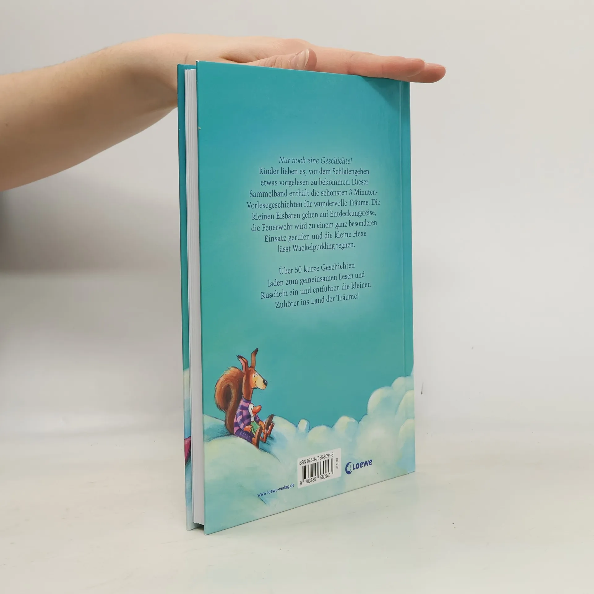 Dieser Vorleseband mit über 50 kurzen Geschichten eignet sich bestens zum abendlichen Vorlesen und Kuscheln und entführt die kleinen Zuhörer ins Land der Träume.Nur noch eine Geschichte! Kinder lieben es, vor dem Schlafengehen etwas vorgelesen zu bekommen. Dieser Sammelband enthält die schönsten 3-Minuten-Geschichten für wundervolle Träume.Die kleinen Eisbären gehen auf Entdeckungsreise, die Feuerwehr wird zu einem ganz besonderen Einsatz gerufen und die kleine Hexe lässt Wackelpudding regnen. Über 50 kurze Geschichten laden zum gemeinsamen Lesen und Kuscheln ein und entführen die kleinen Zuhörer ins Land der Träume!