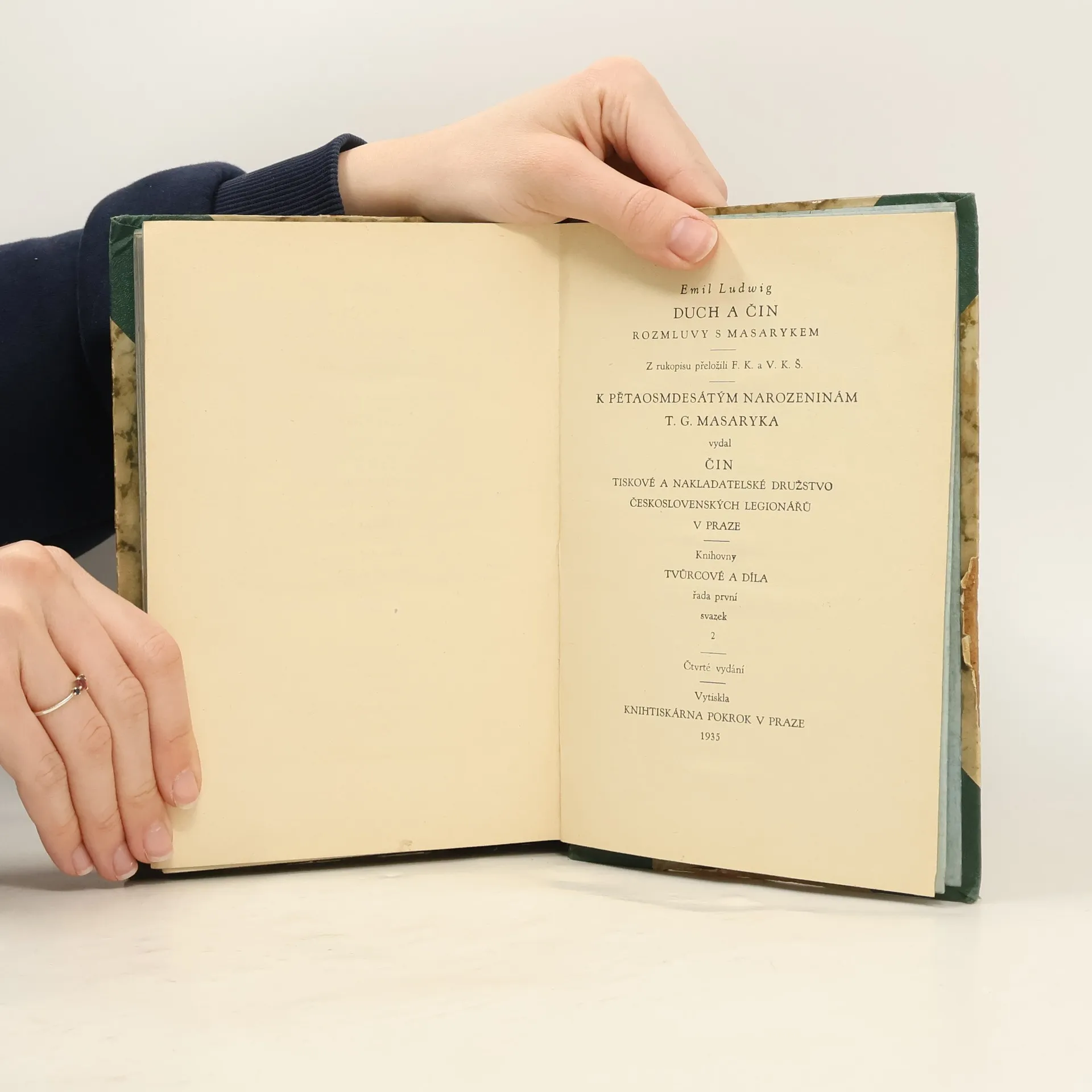 Duch a čin, myšlenka a skutek, dobrá myšlenka a dobrý skutek - jména kterých osobností vás napadnou, řeknete-li si tato slova? Jistě mezi nimi bude jméno T. G. Masaryka. Duch a čin, tak se jmenuje také kniha, kterou dr. Edvard Beneš označil za nejzajímavější knihu po přečtení jejího rukopisu. A opravdu: Každý v ní najde doplňující obraz Masaryka a jeho díla, zachycený spisovatelem světového jména. Touto knihou připojil Emil Ludwig k svým životopisům podobiznu velkého demokrata, filosofa a státníka, spojujícího v dokonalou jednotu teorii a praxi Učinil tak jednak ve vlastním úvodě jednak ve věrném a Masarykem schváleném podání jeho životopisných, filosofických a politických úvah, které zasadil do dobře připraveného rámce. Kniha byla komponována pro čtenáře celého světa, na ně myslil Ludwig, když kladl Masarykovi otázky, aby pronikl k samému jeho jádru. Je také tato kniha všude čtena, neboť byla přeložena do všech hlavních jazyků. A čtou ji všichni protože jak píše Ludwig v předmluvě: Patnáctiletý může porozumět kterékoliv z jejích stránek. Nám je ovšem portrét Masarykův znám a nejsme zvyklí dívat se na Masaryka očima ciziny. Ale při čtení knihy Ludwigovy vystoupí před námi tím více velikost Masarykovy osobnosti Čím více pak se vzdalujeme od Masarykovy přítomnosti, tím více nás Masaryk zajímá a tím více chceme své věci řešit v jeho duchu. A při tom nám pomůže právě tato kniha.
