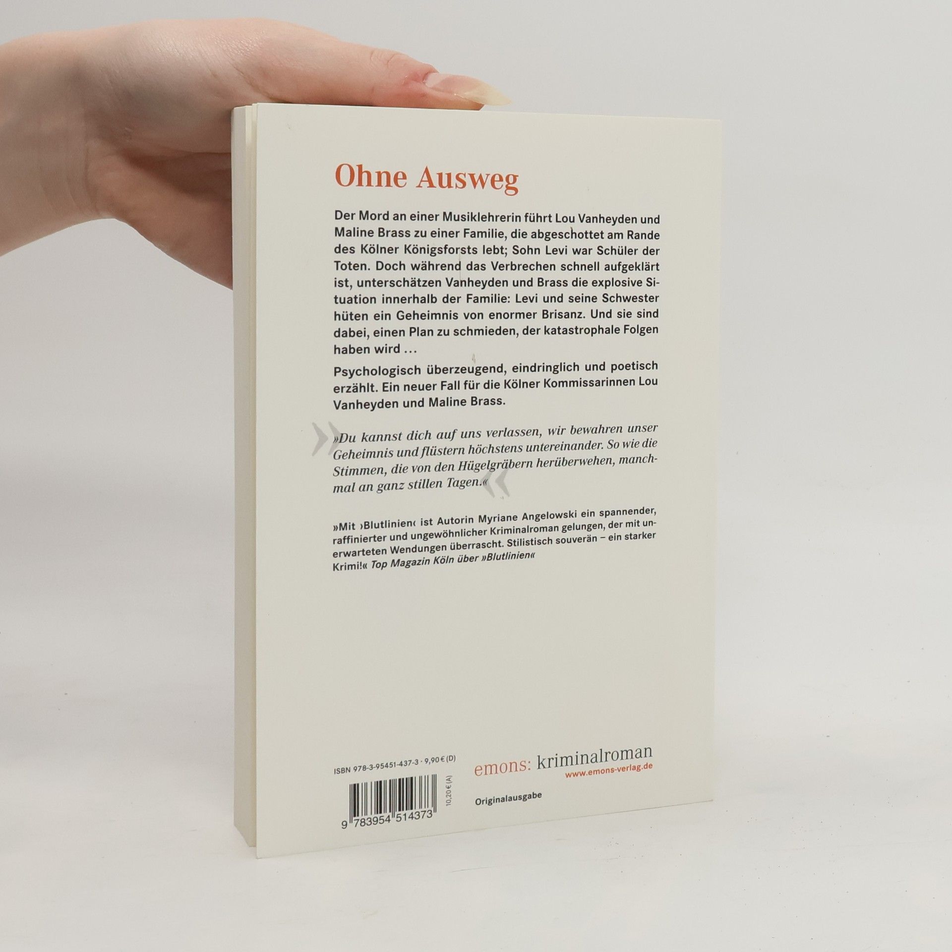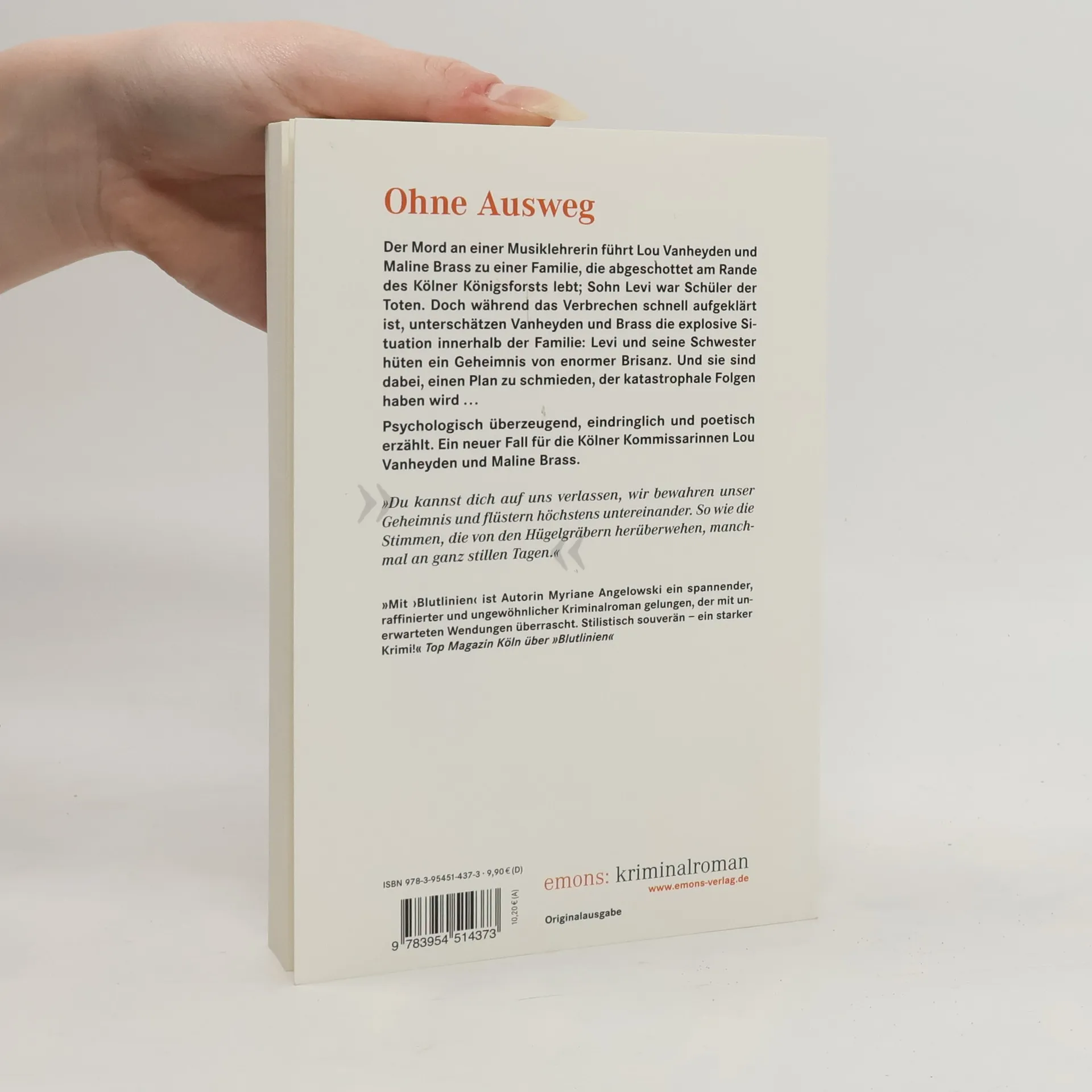 Der Mord an einer Musiklehrerin führt Lou Vanheyden und Maline Brass zu einer Familie, die abgeschottet am Rande des Königsforsts lebt. Sohn Levi war Schüler der Toten. Doch während das Verbrechen schnell aufklärt ist, unterschätzen Vanheyden und Brass die explosive Situation innerhalb der Familie: Levi und seine Schwester hüten ein Geheimnis von enormer Brisanz. Und sie sind dabei, einen Plan zu schmieden, der katastrophale Folgen haben wird...