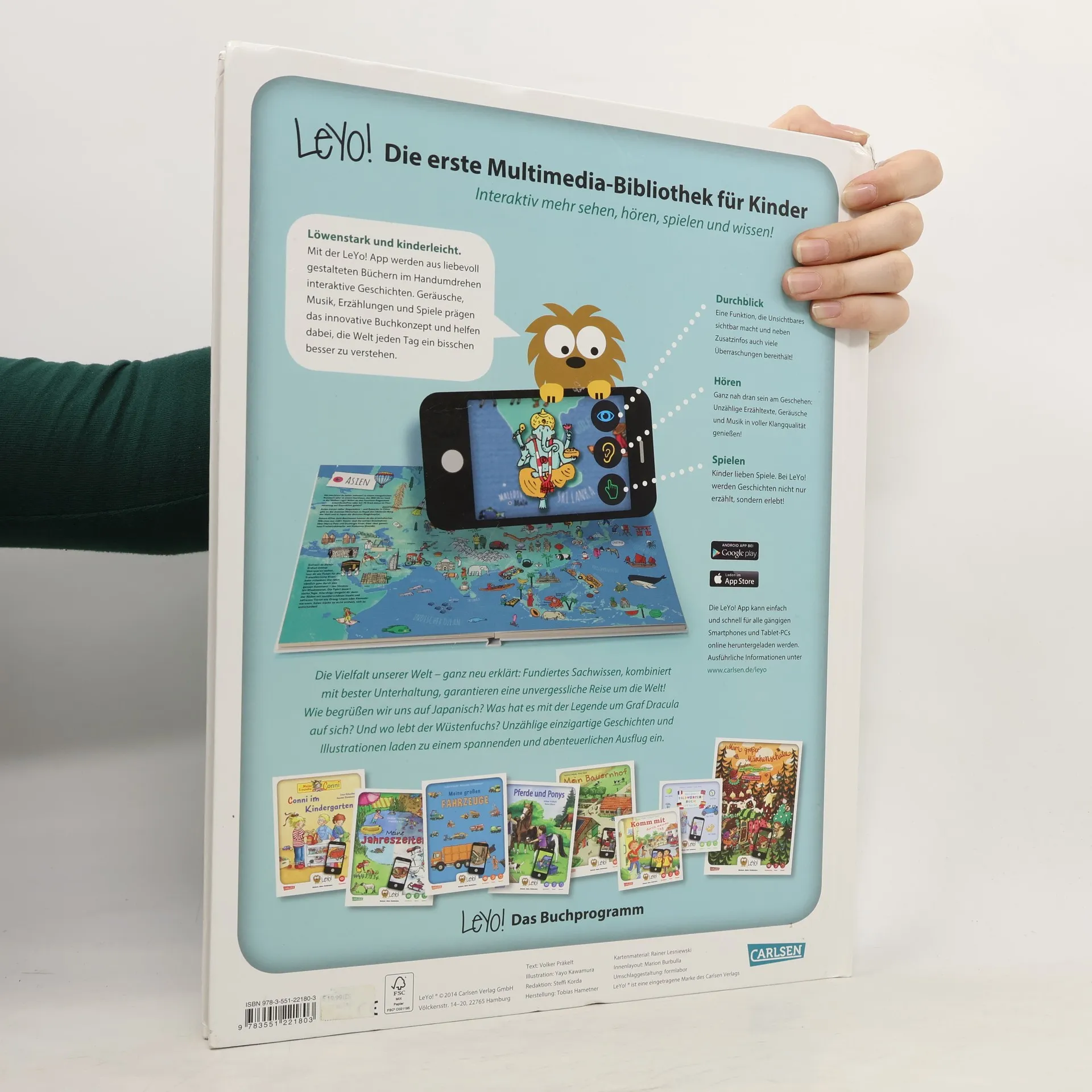 Ein Atlas der besonderen Art und ein echter Familienschatz: Er garantiert einen bildhaften, emotionalen und unvergesslichen Einstieg in unsere Welt mit fundiertem Sachwissen und allerbester Unterhaltung. Wie begrüßen wir uns auf Japanisch? In welchem Land lebt Pippi Langstrumpf? Was ist die Lieblingsspeise der Ureinwohner Australiens? Die Illustrationen und die Ideen sind einzigartig. Wer Wimmelbücher mag, wird hier einen Kinderatlas der ganz besonderen Art für Auge und Ohr entdecken. LeYo! ® Einfach. Mehr. Entdecken. Mit der LeYo! App werden aus liebevoll gestalteten Büchern im Handumdrehen interaktive Geschichten. Erzählungen, Klangwelten, Wissensvermittlung und Spiele vereinen sich in dieser innovativen und multimedialen Kinderbibliothek und helfen dabei, die Welt jeden Tag und spielerisch ein bisschen besser zu verstehen.