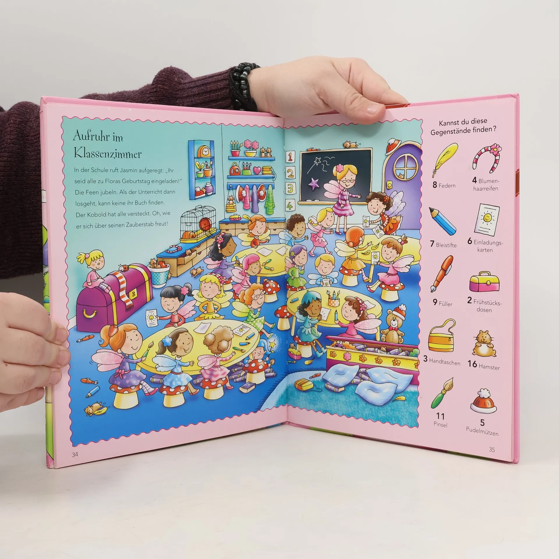 In der rosa glitzernden Traumwelt von Prinzessin Marie und Fee Jasmin gibt es viel zu entdecken! Die Vignetten am Rand zeigen dir, wie viele Schleifen, Blumen und Schmetterlinge du beim Stöbern finden kannst.