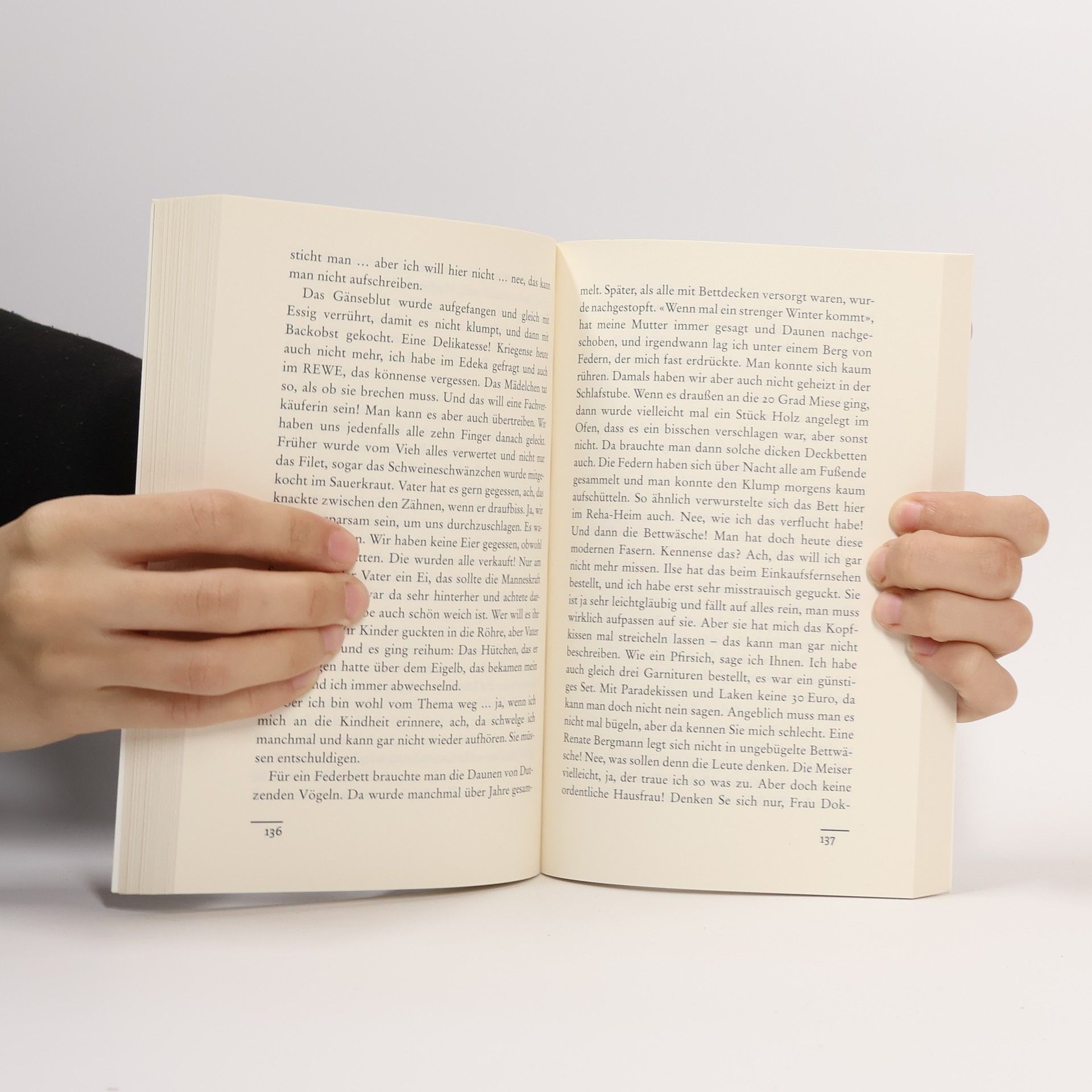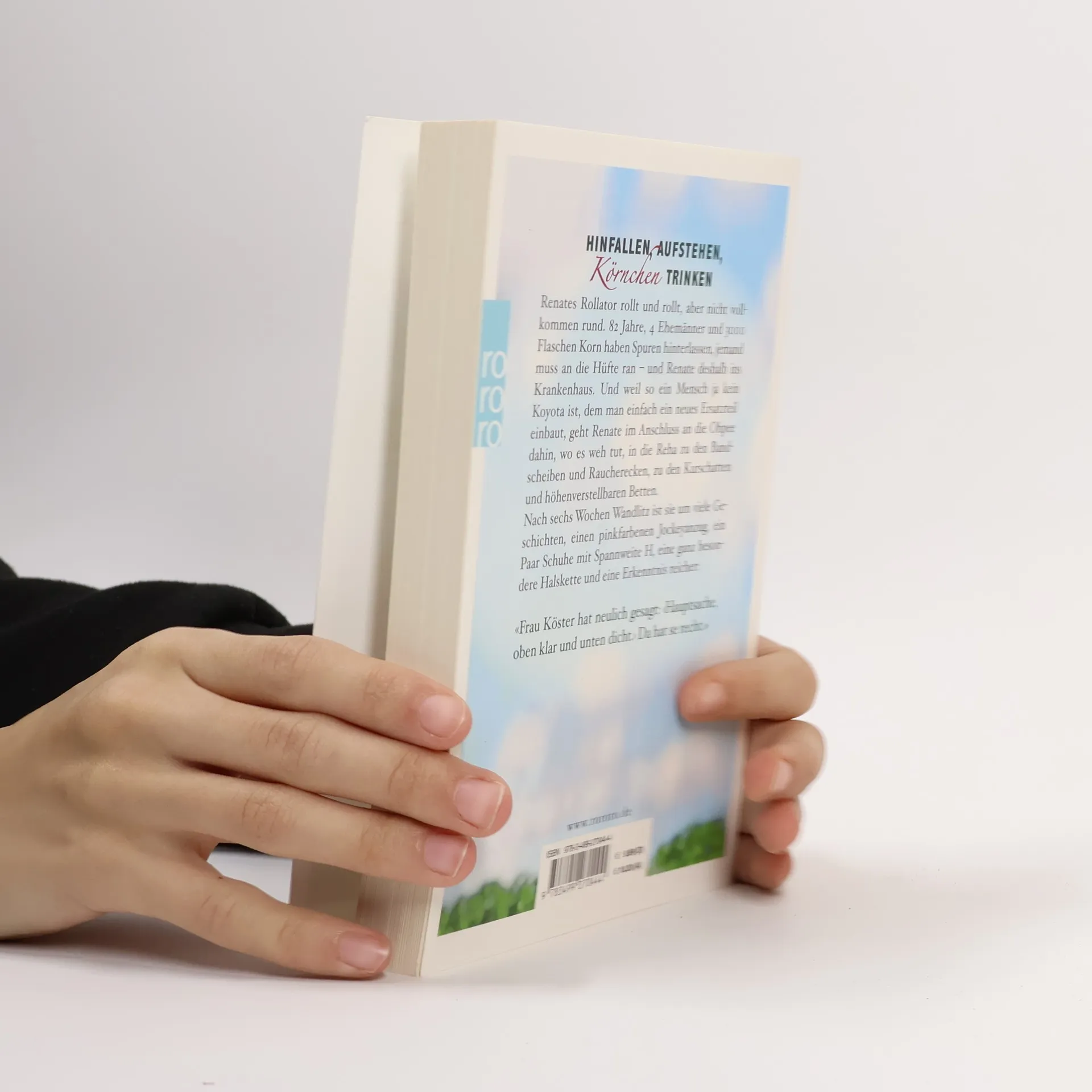Hinfallen, Aufstehen, Körnchen trinken Renates Rollator rollt und rollt, aber nicht vollkommen rund: 82 Jahre, 4 Ehemänner und 3000 Flaschen Korn haben Spuren hinterlassen, jemand muss an die Hüfte ran – und Renate deshalb ins Krankenhaus. Und weil so ein Mensch ja kein Koyota ist, dem man einfach ein neues Ersatzteil einbaut, geht Renate im Anschluss an die Ohpee dahin, wo es wehtut, zu den Bandscheiben und Raucherecken, zu den Kurschatten und höhenverstellbaren Betten: In die Reha, die sie kurzerhand zur Kur erklärt und rockt. Nach sechs Wochen Wandlitz ist sie um viele Geschichten, einen pinkfarbenen Jockeyanzug, ein paar Schuhe mit Spannweite H, eine ganz besondere Halskette und eine Erkenntnis reicher: «Frau Köster hat neulich gesagt 'Hauptsache, oben klar und unten dicht.'»Da hat se recht.