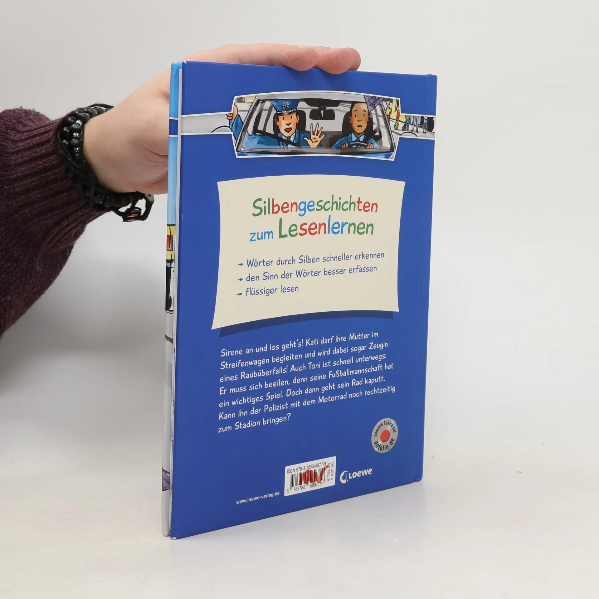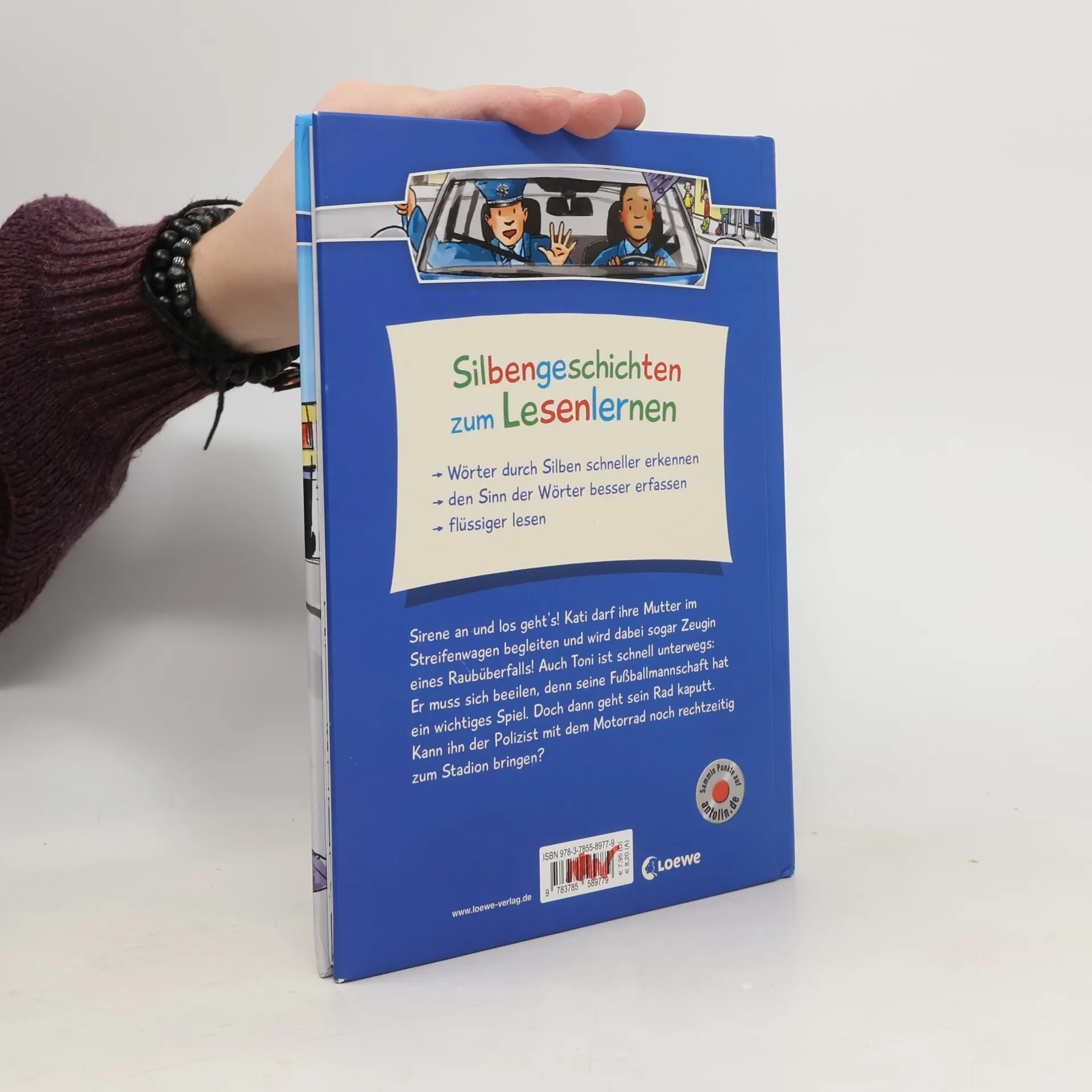 Das Buch ist bei deiner Buchhandlung vor Ort und bei vielen Online-Buchshops erhältlich!+ Bücher, die Kinder gerne lesen wollen + Beliebtes Thema: Polizei + Ausgewogenes Text-Bild-Verhältnis + Große Schrift + Kurze Kapitel + Geeignet zum Vorlesen und ersten Selberlesen + Ideal zum Lesenlernen + Hochwertiges Hardcover + Mit vielen farbigen Illustrationen + Bewährte Qualität + Sirene an und los geht’s! Kati darf ihre Mutter im Streifenwagen begleiten und wird dabei sogar Zeugin eines Raubüberfalls! Auch Toni ist schnell unterwegs: Er muss sich beeilen, denn seine Fußballmannschaft hat ein wichtiges Spiel. Doch dann geht sein Rad kaputt. Kann ihn der Polizist mit dem Motorrad noch rechtzeitig zum Stadion bringen? Mit Silben flüssig lesen lernen! Durch kurze, einfache Sätze in großer Fibelschrift können Kinder ab 7 Jahren (2. Klasse) leicht lesen lernen. Die Silbenmethode unterstützt sie dabei: Die farbige Markierung der einzelnen Silben sorgt für bessere Erkennbarkeit und damit für einen schnelleren Leseerfolg. Diese verbessert nachweislich die Rechtschreibung. Die vielen bunten Bilder in diesem Kinderbuch tragen zusätzlich zum Textverständnis bei. Auch auf Antolin gelistet.