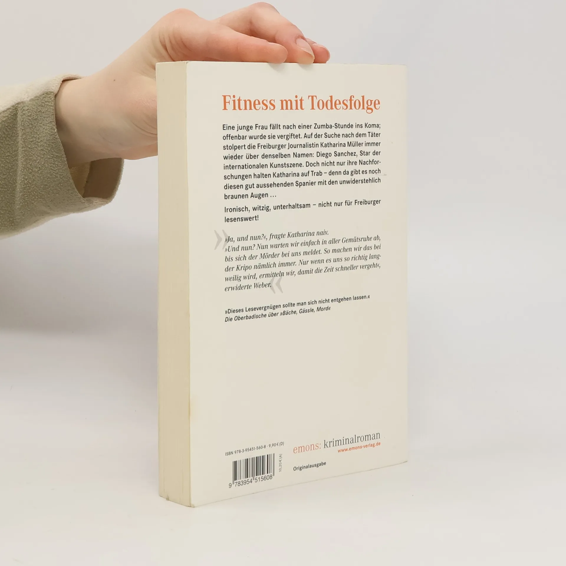 Eine junge Frau fällt nach einer Zumba-Stunde ins Koma; offenbar wurde sie vergiftet. Auf der Suche nach dem Täter stolpert die Freiburger Journalistin Katharina Müller immer wieder über denselben Namen: Diego Sanchez, Star der internationalen Kunstszene. Doch nicht nur ihre Nachforschungen halten Katharina auf Trab – denn da gibt es noch diesen gut aussehenden Spanier mit den unwiderstehlich braunen Augen . . . Ironisch, witzig, unterhaltsam – nicht nur für Freiburger lesenswert!