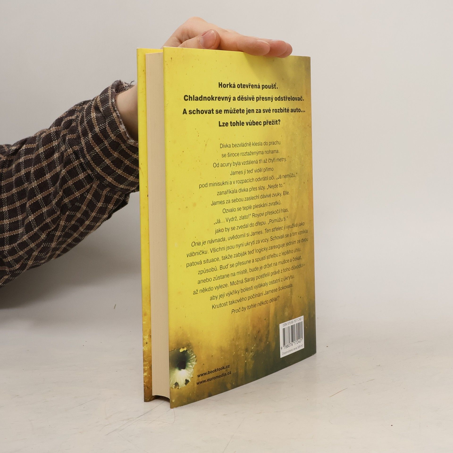 Další kniha od Taylora Adamse, autora strhujícího thrilleru Není úniku, mistra příběhů o mezních situacích, napínavých v každé vteřině a dramatických až do překvapivého závěru. Mladí manželé James a Elle Eversmanovi projíždějí Mohavskou pouští vstříc novému životu. Nečekaně se jim porouchá auto a oni uvíznou uprostřed pustiny, bez vody, mobilního signálu a jakékoli šance na záchranu. Z více jak kilometrové vzdálenosti je drží na mušce chladnokrevný a děsivě přesný odstřelovač. James s Elle jsou uvězněni za rozbitým autem a ze všech stran je obklopuje jen otevřené prostranství. Není kam se schovat ani kam utéct a nikdo nepřichází na pomoc. Dá se tohle vůbec přežít?