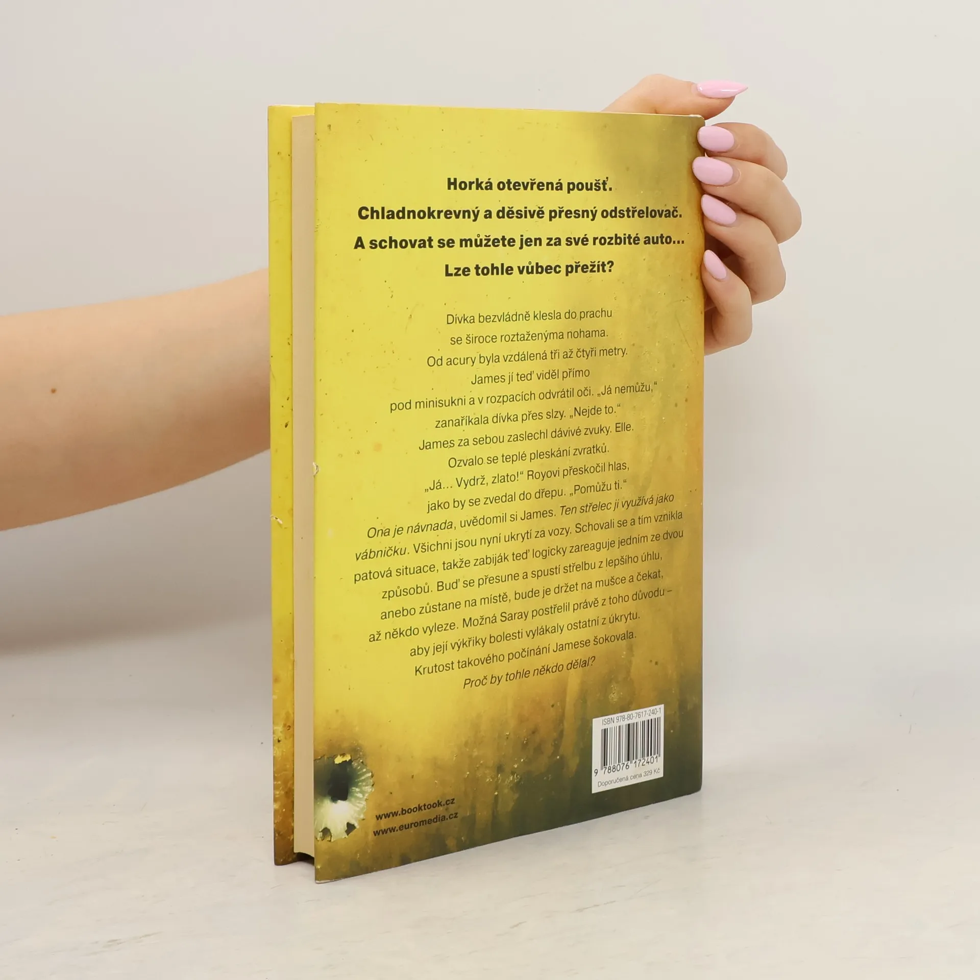 Další kniha od Taylora Adamse, autora strhujícího thrilleru Není úniku, mistra příběhů o mezních situacích, napínavých v každé vteřině a dramatických až do překvapivého závěru. Mladí manželé James a Elle Eversmanovi projíždějí Mohavskou pouští vstříc novému životu. Nečekaně se jim porouchá auto a oni uvíznou uprostřed pustiny, bez vody, mobilního signálu a jakékoli šance na záchranu. Z více jak kilometrové vzdálenosti je drží na mušce chladnokrevný a děsivě přesný odstřelovač. James s Elle jsou uvězněni za rozbitým autem a ze všech stran je obklopuje jen otevřené prostranství. Není kam se schovat ani kam utéct a nikdo nepřichází na pomoc. Dá se tohle vůbec přežít?