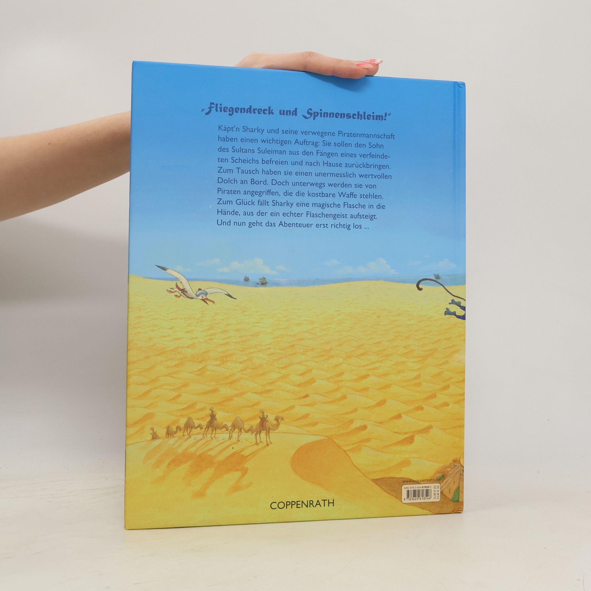 Fliegendreck und Spinnenschleim! Käpt’n Sharky und seine Mannschaft haben eine wichtige Aufgabe. Im Auftrag des Sultans Suleiman sollen sie dessen Sohn Fadi aus dem Land eines verfeindeten Scheichs nach Hause zurückholen. Als Geschenk für den Scheich haben sie einen wertvollen Dolch an Bord. Doch unterwegs werden sie von Piraten angegriffen, die die kostbare Waffe stehlen wollen. Zum Glück fällt Sharky eine magische Flasche in die Hände, aus der ein echter Geist aufsteigt. Und nun geht das Abenteuer erst richtig los.