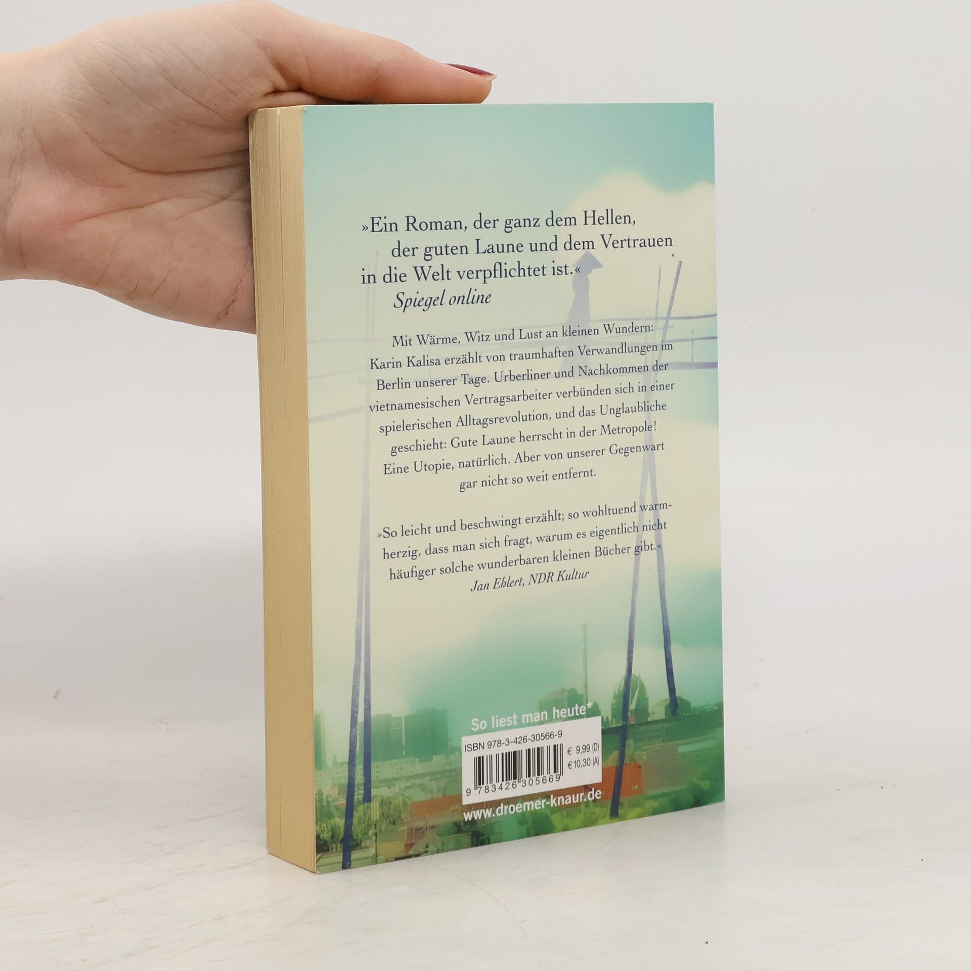 Der Bestseller von Karin Kalisa ist ein Sommer-Roman mit Tiefgang für jede Lebenslage. Mit Wärme, Witz und Lust an kleinen Wundern erzählt Karin Kalisa von traumhaften Verwandlungen im Berlin unserer Tage. Ausgehend vom kleinen vietnamesischen Laden des studierten Archäologen Sung nimmt eine Völkerverständigung der ganz eigenen Art ihren Lauf. Urberliner und Nachkommen der vietnamesischen Vertragsarbeiter verbünden sich in einer spielerischen Alltagsrevolution: Brücken aus Bambus spannen zwischen den Häusern, Parkwächter tragen Kegelhüte, auf Brachflächen grünt exotisches Gemüse, und ein Zahnarzt macht Sonntagsdienst für Patienten aus Fernost. Das Unglaubliche geschieht: Gute Laune herrscht in der Metropole! Eine Utopie, natürlich. Aber von unserer Gegenwart gar nicht so weit entfernt. „So leicht und beschwingt erzählt, so wohltuend warmherzig, dass man sich fragt, warum es eigentlich nicht häufiger solche wunderbaren kleinen Bücher gibt.“ Jan Ehlert, NRD Kultur