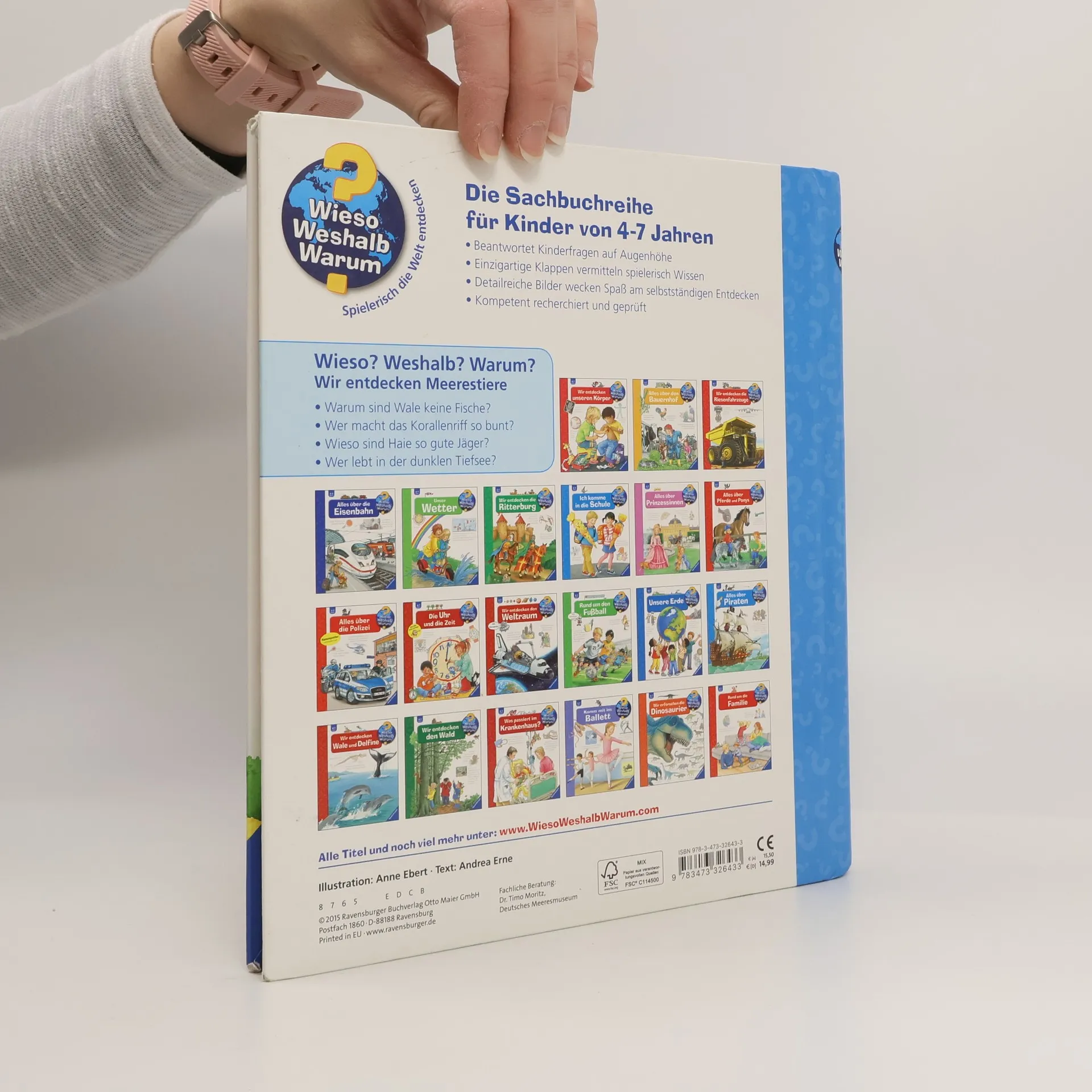 Willkommen in der größten WG der Welt: dem Meer! In diesem faszinierenden Lebensraum tummeln sich zahllose Tiere. Das Buch zeigt beliebte Säugetiere wie Wale und Delfine, aber auch Räuber wie Haie und besonders ungewöhnliche Vertreter wie Tiefseefische aus nächster Nähe. Kinder erfahren, warum Fische zum Atmen nicht auftauchen müssen, was im Korallenriff los ist und wieso sich der Kugelfisch eigentlich aufbläst. Wieso? Weshalb? Warum? Die Sachbuchreihe für Kinder von 4–7 Jahren Jeden Tag entdecken Kinder etwas Neues – da kommen viele Fragen auf. Warum sind die Dinosaurier ausgestorben? Wo ist die Sonne in der Nacht? Wozu brauchen wir das Blut? Die beliebte Sachbuchreihe Wieso? Weshalb? Warum? gibt Kindern Antworten auf Augenhöhe. Dabei werden die unterschiedlichsten Themen aus der Alltags- und Interessenswelt der Kinder altersgerecht und mit viel Liebe zum Detail unter die Lupe genommen. Detailreiche Bilder, verständliche Sachtexte und überraschende Klappen, die Bewegungen oder Abläufe veranschaulichen und hinter die Dinge blicken lassen, ermöglichen Kindern, sich ihre Themen selbst zu erschließen. Der Spaß am eigenhändigen Entdecken, die liebevolle Umsetzung und die qualitativ hochwertige Ausstattung garantieren langanhaltende Freude an jedem einzelnen Buch.