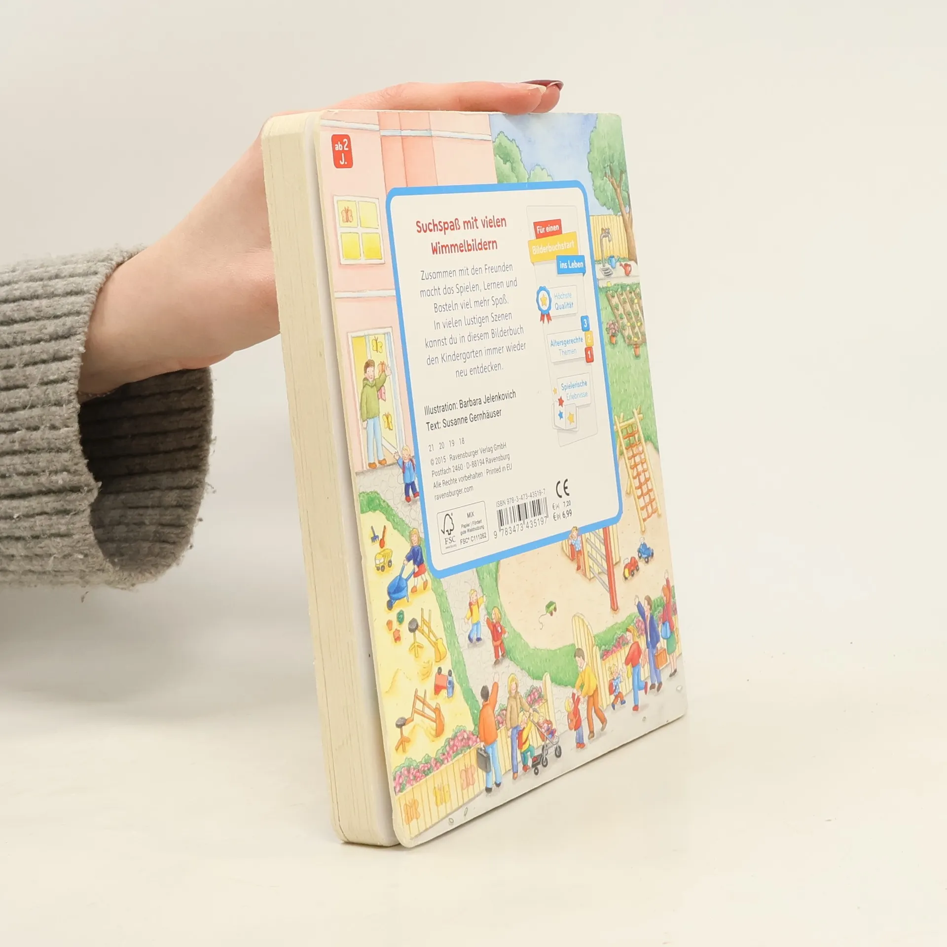 Willkommen im Kindergarten! Auf elf farbenfrohen, realitätsnahen Illustrationen werden alle Fragen zum Thema Kindergarten beantwortet. Ob drinnen oder draußen: hier macht das Spielen mit den kleinen Freunden Spaß. Es gibt eine Kinderküche, einen Waschraum, einen Turnraum und natürlich Spiel- und Kuschelecken. Die kurzen Texte beinhalten auf jeder Seite einen leichten Suchauftrag, der dazu motiviert die kleinen Bilder in den großen Schauseiten zu suchen und zu benennen. Das schult die Konzentrationsfähigkeit und fördert den Spracherwerb. Schon in der Garderobe wird klar: In diesem Kindergarten kommen alle Kinder gerne an. Die kleinen Freunde werden begrüßt und helfen sich gegenseitig. Es geht weiter in die Gemeinschaftsräume zum Spielen, Basteln, Singen und Turnen. Natürlich gibt es auch eine Kuschel- und Vorleseecke. Und der Waschraum hat extra kleine Waschbecken und niedrige Kindertoiletten. Da macht das Händewaschen Spaß! Auf einer weiteren Seite wird Geburtstag gefeiert, zusammen musiziert und auch geturnt. Natürlich gehen die Kinder zusammen nach draußen: Im Garten kann getobt, gebuddelt und geklettert werden. Ein umfangreiches Themenbuch, ideal als Einstiegshilfe in den Kindergartenalltag. Einfache Texte mit kleinen Suchaufträgen regen dazu an, die Bildervignetten auf der rechten Seite im großen Bild zu suchen und wiederzuentdecken.