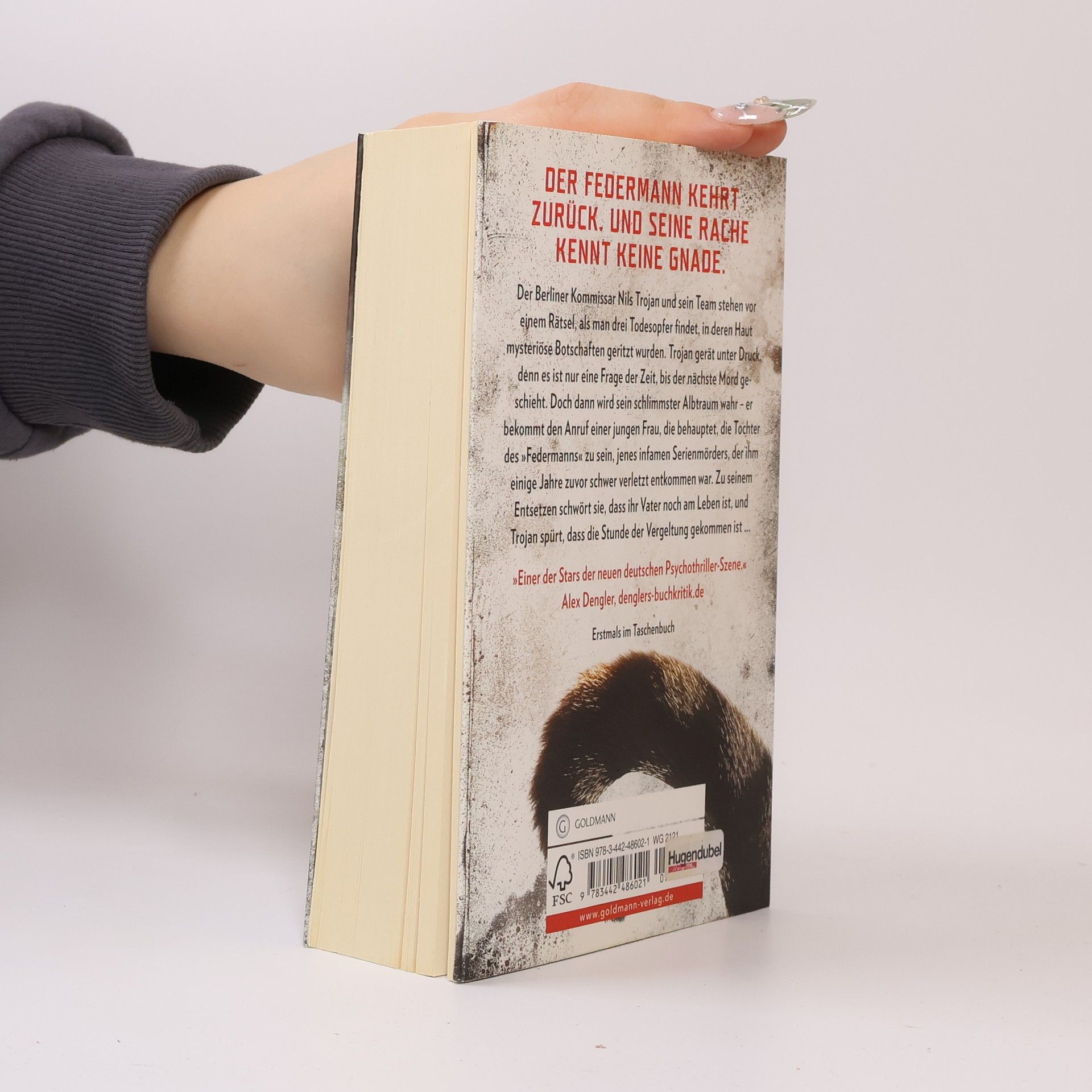 Der Berliner Kommissar Nils Trojan und sein Team stehen vor einem Rätsel, als man drei Todesopfer findet, in deren Haut mysteriöse Botschaften geritzt wurden. Trojan gerät unter Druck, denn es ist nur eine Frage der Zeit, bis der nächste Mord geschieht. Doch dann wird sein schlimmster Albtraum wahr – er bekommt den Anruf einer jungen Frau, die behauptet, die Tochter des „Federmanns“ zu sein, jenes infamen Serienmörders, der ihm einige Jahre zuvor schwer verletzt entkommen war. Zu seinem Entsetzen schwört sie, dass ihr Vater noch am Leben ist, und Trojan spürt, dass die Stunde der Vergeltung gekommen ist ...