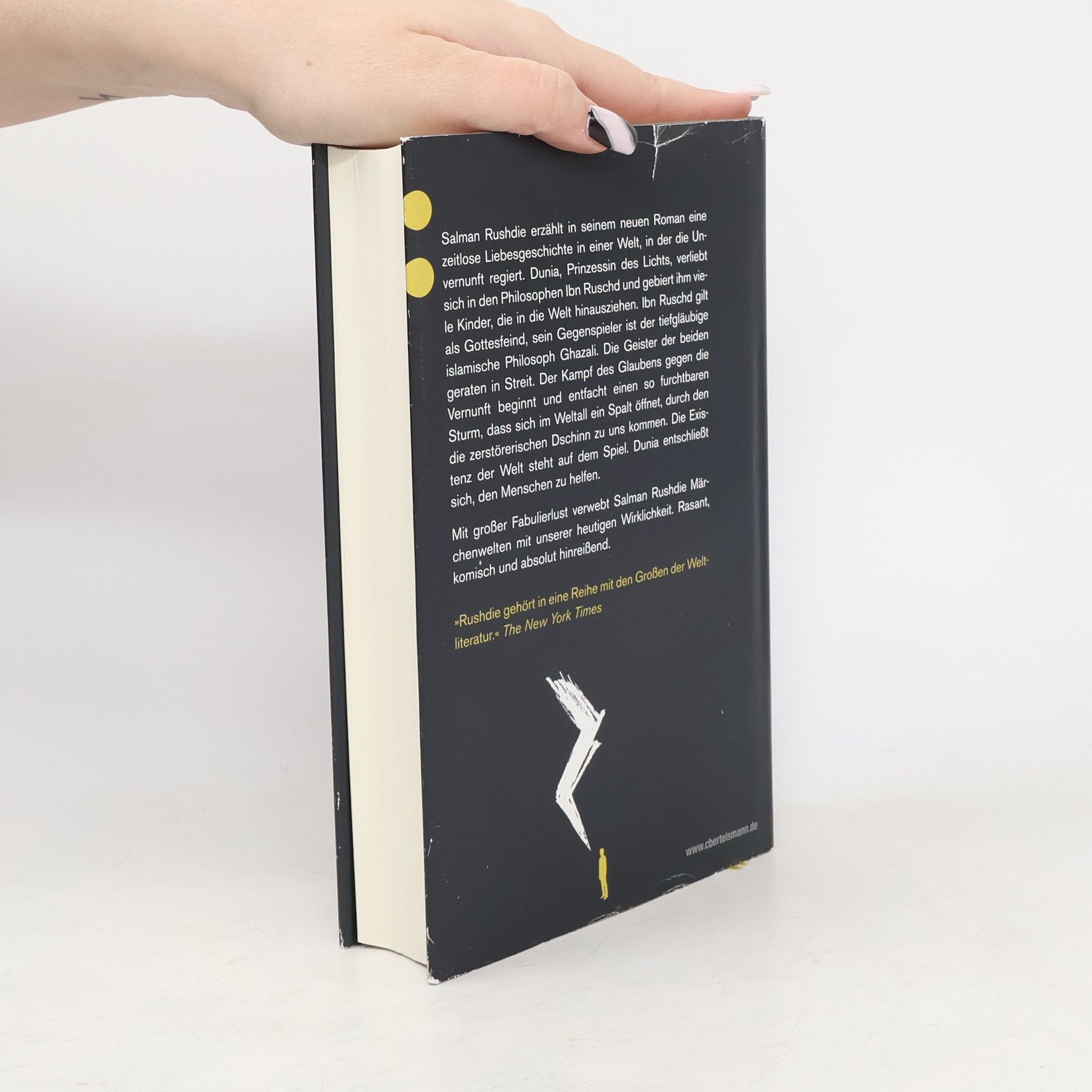 Salman Rushdie erzählt in seinem neuen Roman eine zeitlose Liebesgeschichte in einer Welt, in der die Unvernunft regiert. Dunia, die Fürstin des Lichts, verliebt sich in den Philosophen Ibn Rush und zeugt mit ihm viele Kinder, die in die Welt hinaus ziehen. Ibn Rush gilt als Gottesfeind, sein Gegenspieler ist der tiefgläubige islamische Philosoph Ghazali. Die Geister der beiden geraten in Streit. Der Kampf des Glaubens gegen die Vernunft beginnt und entfacht einen so furchtbaren Sturm, dass sich im Weltall ein Spalt öffnet, durch den die zerstörerischen Dschinn zu uns kommen. Die Existenz der Welt steht auf dem Spiel. Dunia entschließt sich, den Menschen zu helfen. Mit großer Fabulierlust verwebt Salman Rushdie Märchenwelten mit unserer heutigen Wirklichkeit. Rasant, komisch und absolut hinreißend, denn Zwei Jahre, acht Monate und achtundzwanzig Nächte ergeben genau tausendundeine Nacht.