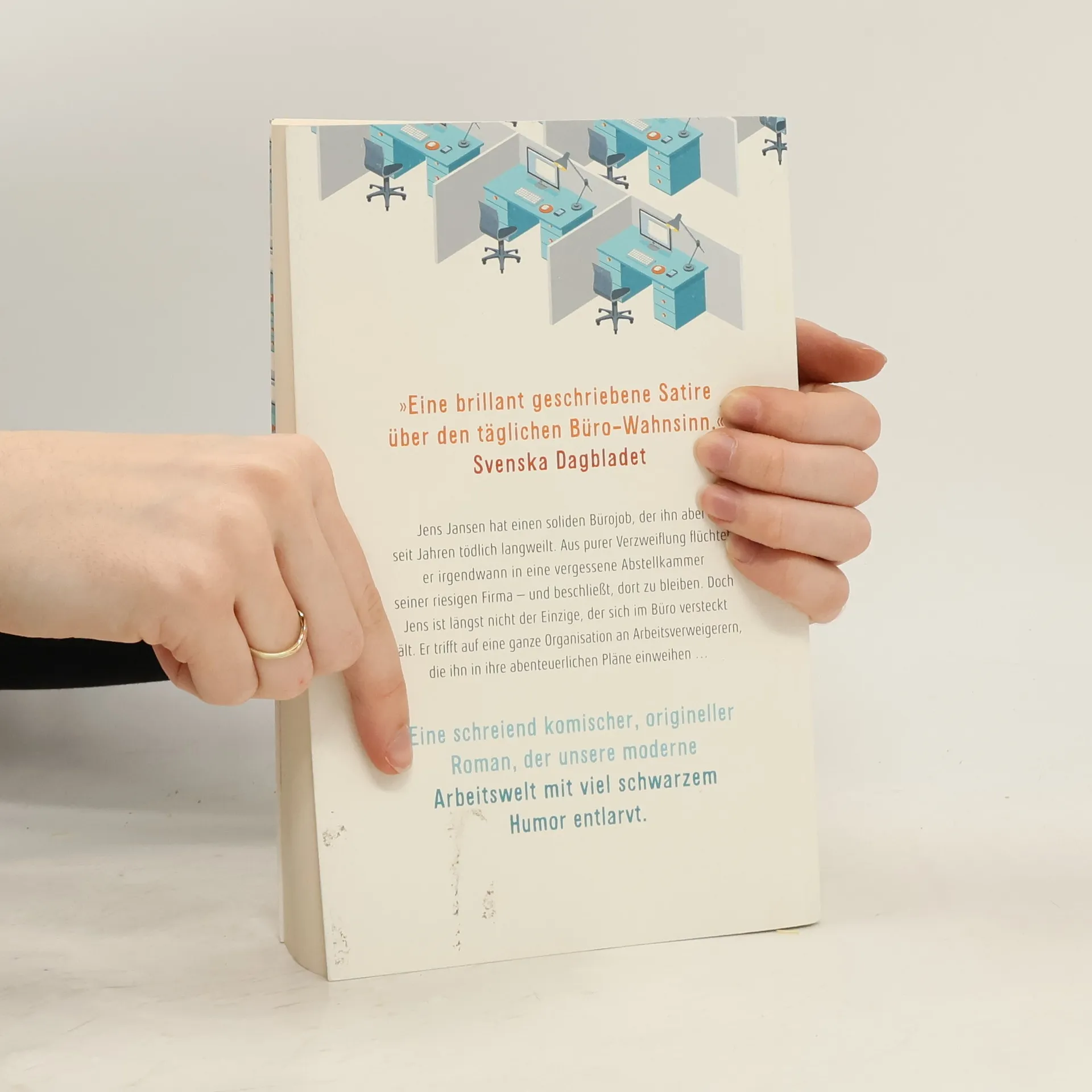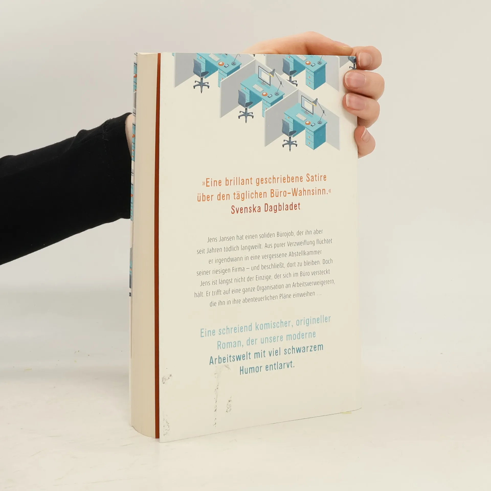 Jens Jansen ist ein absoluter Durchschnittsmensch: Er arbeitet in einem mittelständischen Unternehmen, hat ein ansehnliches Jahresgehalt, eine Eigentumswohnung und eine langjährige Freundin. Trotzdem quält ihn eine große innere Leere. Beruflich hat er sich schon längst aufs Nichtstun spezialisiert – auch wenn das niemand bemerkt. Um einer bevorstehenden Beförderung zu entgehen, zieht Jens Jansen lieber radikale Konsequenzen: Er versteckt sich in einem längst vergessenen Abstellraum im labyrinthischen Bürokomplex seiner Firma. Zur Tarnung, falls er doch jemanden treffen sollte, verkleidet er sich als Ninja. Doch mit der Ruhe ist es vorbei, als Jens erfährt, dass er nicht der Einzige ist, der sich in einem Büro versteckt hält. Er erfährt von einer heimlichen Organisation, die den ehrgeizigen Plan hat, die Menschen vom Arbeitswahn zu befreien …Lars Berge hat eine schreiend komische, kluge Satire geschrieben, in der er die moderne Arbeitswelt mit viel schwarzem Humor entlarvt. Mit unbändigem Einfallsreichtum spielt er einen Wunsch durch, der vielen bekannt sein dürfte: angesichts des alltäglichen Bürowahnsinns einfach zu verschwinden.