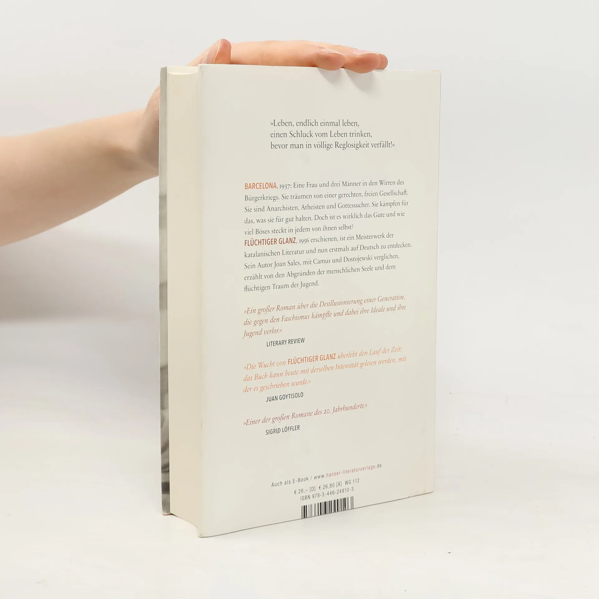 Im belagerten Barcelona wütet das Chaos. Lluis, Atheist, ehemaliger Anarchist und Skeptiker, verlässt seine Frau, um in den Bergen mit den Republikanern zu kämpfen. Doch es ist eine „tote Front“, wo die Anarchisten Klöster verwüsten und Zivilisten hinrichten. Lluis ist entsetzt, überschreitet aber selbst die Grenze der Moral und sucht Antworten auf seine Fragen nach dem Ursprung des Bösen, nach Gott und den Möglichkeiten der Liebe. „Flüchtiger Glanz“ ist einer der großen Romane des 20. Jahrhunderts, in dem Freundschaft und Verrat, Liebe und Tod aufs Engste verwoben sind. Der Katalane Joan Sales wurde mit Camus und Dostojewski verglichen; sein 1956 erschienener Roman ist nun erstmals auf Deutsch zu entdecken.