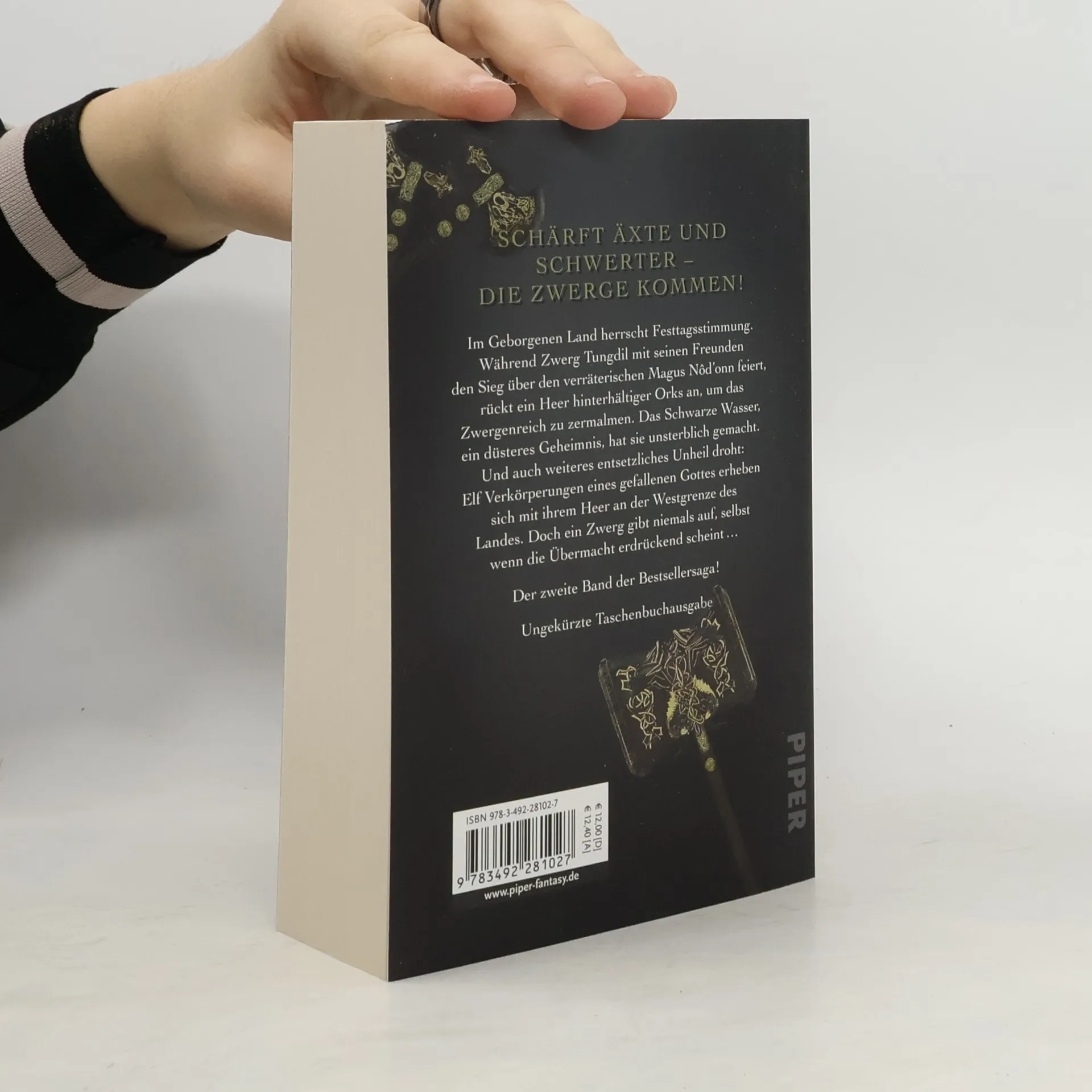 Im Geborgenen Land herrscht Festtagsstimmung. Während Zwerg Tungdil mit seinen Freunden den Sieg über den verräterischen Magus Nôd›onn feiert, wälzt sich ein Heer hinterhältiger Orks heran, um das Zwergenreich zu zermalmen. Das Schwarze Wasser, ein düsteres Geheimnis, hat sie unsterblich gemacht, und schon bald müssen Tungdil und seine Gefährten ihre ganze Tapferkeit aufbieten, um sich den Bösewichtern entgegenzuwerfen. Inzwischen braut sich ein entsetzliches Unheil zusammen: Elf Verkörperungen des Gottes des Bösen stehen mit ihrem Heer an der Westgrenze des Landes. Doch ein Zwerg gibt seinen Besitz erst auf, wenn die letzte Axt geschwungen ist …