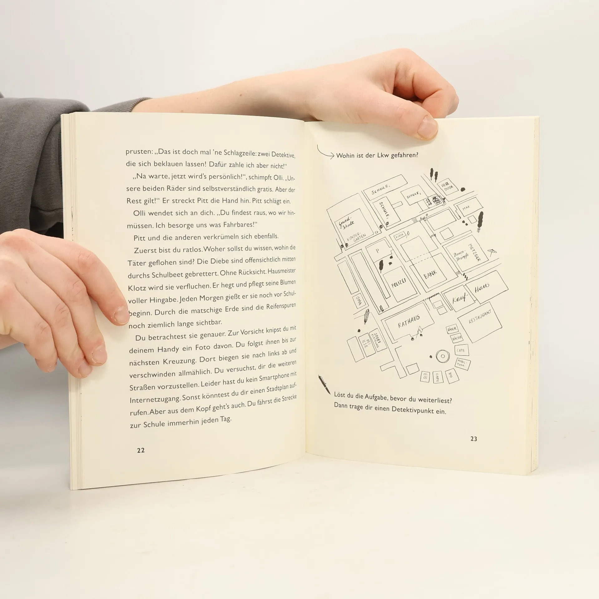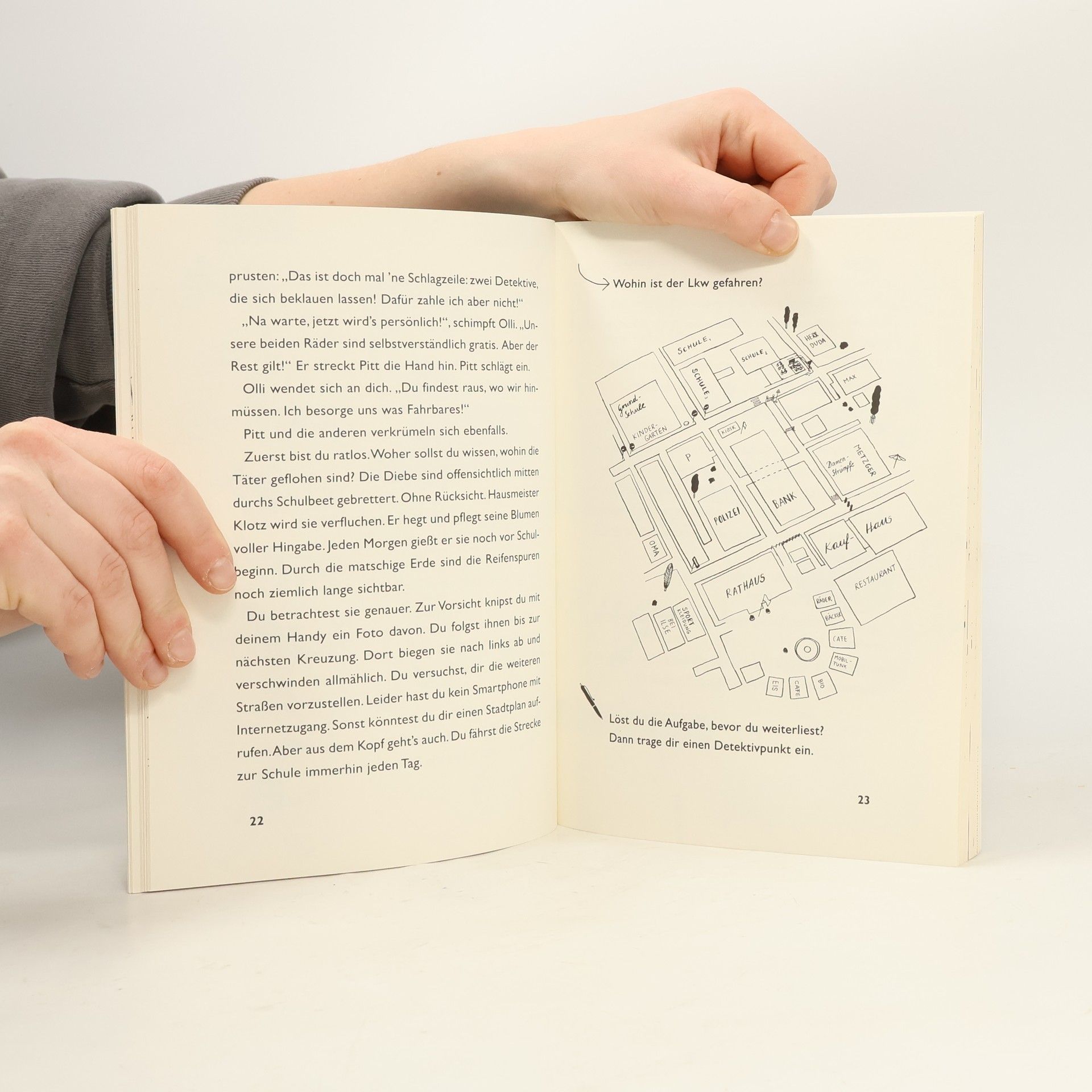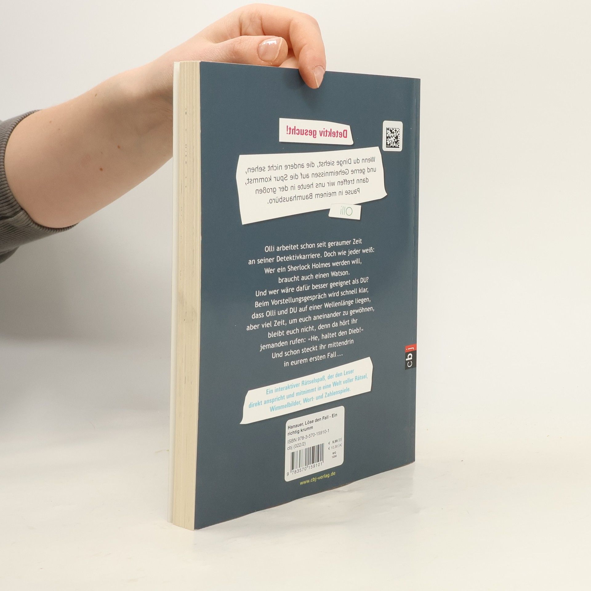 Detektiv gesucht! Wenn du Dinge siehst, die andere nicht sehen. Wenn du gerne Geheimnisse aufspürst, die andere nicht einmal spüren, dann komm heute in der großen Pause ins Baumhaus. Olli arbeitet schon seit geraumer Zeit an seiner Detektivkarriere. Doch wie jeder weiß, wer ein Sherlock Holmes werden will, braucht auch einen Watson. Und wer wäre dafür besser geeignet als der Leser selber? Beim Vorstellungsgespräch wird schnell klar, das Olli und der Leser auf einer Wellenlänge liegen, aber viel Zeit um sich aneinander zu gewöhnen, bleibt ihnen nicht, denn sie hören jemanden rufen: »He, haltet den Dieb!« Und da stecken sie auch schon mittendrin, in ihrem ersten Fall ... Ein interaktiver Rätselspaß, der den Leser direkt anspricht und mitnimmt in eine Welt voller Rätsel, Wimmelbilder, Wort- und Zahlenspiele. Ausstattung: Mit s/w Illustrationen