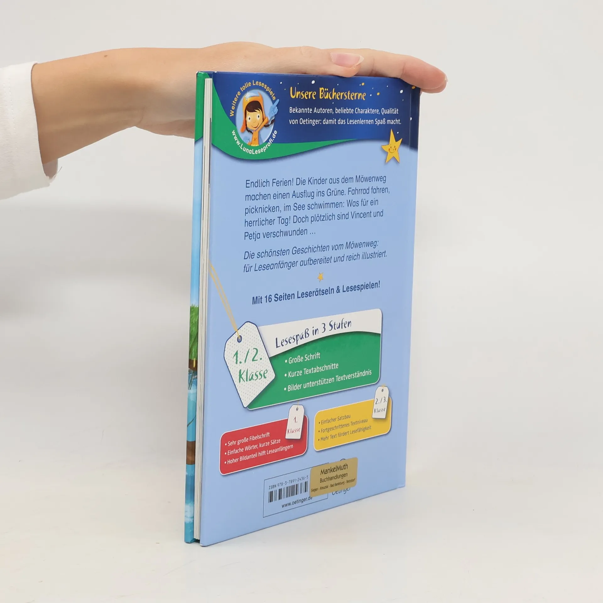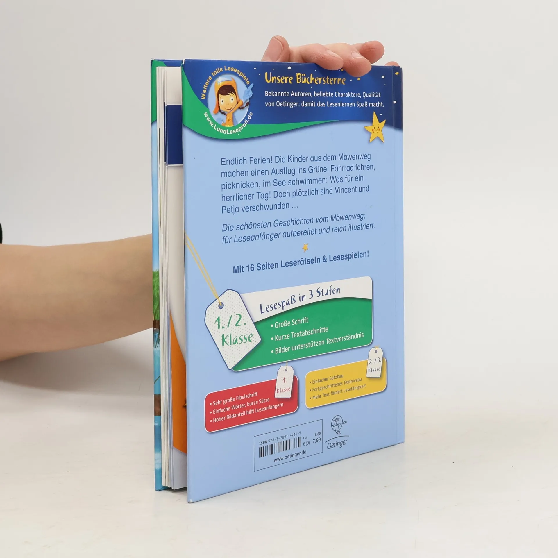 Wie schön es ist im Möwenweg, wenn endlich Ferien sind! Die Kinder im Möwenweg freuen sich ganz fürchterlich auf die Sommerferien! Jeden Tag können sie etwas unternehmen. Gleich am ersten Ferientag schlägt Michael, der lustigste von allen Vätern einen Ausflug mit dem Fahrrad zum Badesee vor. Mit dem Rad durch die Felder fahren, ein Picknick machen und im See schwimmen gehen: ein Tag im Grünen könnte nicht schöner sein! Doch plötzlich bekommen alle einen großen Schreck: Petja und Vincent sind nicht mehr im Wasser zu sehen. Sie sind doch nicht ertrunken? „Abenteuer im Möwenweg“ von Kirsten Boie wurde extra für Leseanfänger sprachlich aufbereitet.