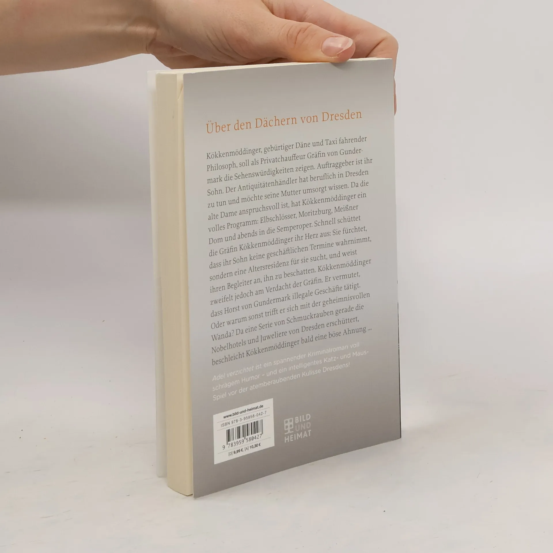 Kökkenmöddinger, gebürtiger Däne und Taxi fahrender Philosoph in Dresden, erhält einen Sonderauftrag: Er soll als Privatchauffeur Gundula Gräfin von Gundermark die Stadt zeigen. Auftraggeber ist ihr Sohn Horst von Gundermark. Der attraktive Antiquitätenhändler hat geschäftlich in Dresden zu tun und möchte seine Mutter kulturell gut umsorgt wissen. Da die alte Dame anspruchsvoll ist, hat Kökkenmöddinger ein volles Programm: Elbschlösser, Frauen- und Kreuzkirche, Semperoper, Staatsschauspiel, Dresdner Zwinger. Abends fällt er totmüde ins Bett, kaum dass er mal ein Wort mit seiner Mitbewohnenrin Jelena wechseln kann. Er ist heimlich verliebt in die Radiomoderatorin, die ihn aber allzu oft am ausgestreckten Arm verhungern lässt. Nach zwei Tagen Sightseeing schüttet die Gräfin Kökkenmöddinger ihr Herz aus: Sie fürchtet, dass ihr Sohn keinesfalls geschäftliche Termine wahrnimmt, sondern ein Seniorenheim für sie sucht. Sie weist ihren Begleiter an, den Sohn zu beschatten. Kökkenmöddinger nimmt die Spur auf, zweifelt jedoch schnell am Verdacht der Gräfin. Er vermutet, dass der Sohn schmutzige Geschäfte tätigt. Oder warum sonst drückt sich Horst von Gundermark vor edlen Residenzen herum und trifft sich mehrmals mit der undurchsichtigen Wanda Organza? Als Kökkenmöddinger auch noch von Jelena erfährt, dass gerade eine Serie von Schmuckrauben Nobelhotels und Juweliere in Dresden erschüttert, hat er eine böse Ahnung … Christine Sylvesters Kriminalroman Adel verzichtet ist ein raffiniertes Spiel mit der Täter-Opfer-Frage – und ein atemberaubendes Katz- und Mausspiel vor der beeindruckenden Kulisse Dresdens!