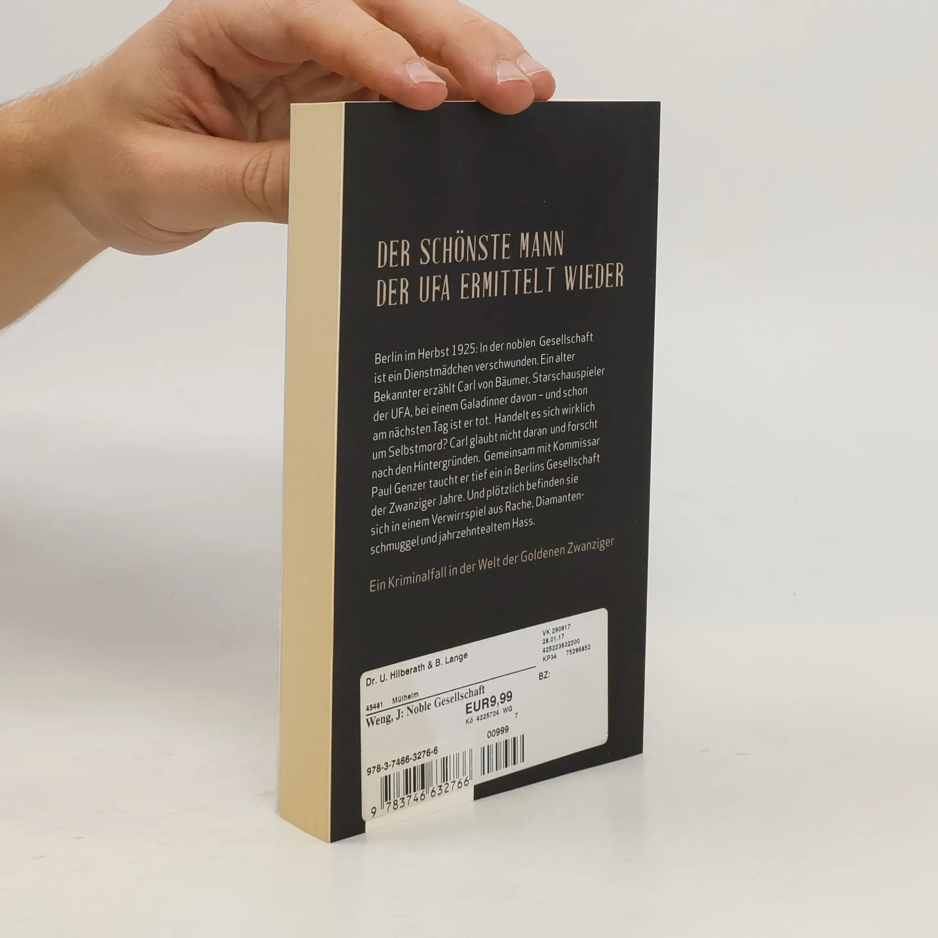 Der schönste Mann der UFA ermittelt wieder. Berlin im Herbst 1925: In der noblen Gesellschaft ist ein Dienstmädchen verschwunden. Ein alter Bekannter erzählt Carl von Bäumer, Starschauspieler der UFA, bei einem Galadinner davon – und schon am nächsten Tag ist er tot. Handelt es sich wirklich um Selbstmord? Carl glaubt nicht daran und forscht nach den Hintergründen. Gemeinsam mit Kommissar Paul Genzer taucht er tief ein in Berlins Gesellschaft der Zwanziger Jahre. Und plötzlich befinden sie sich in einem Verwirrspiel aus Rache, Diamantenschmuggel und jahrzehntealtem Hass. Ein Kriminalfall in der Welt der Goldenen Zwanziger.