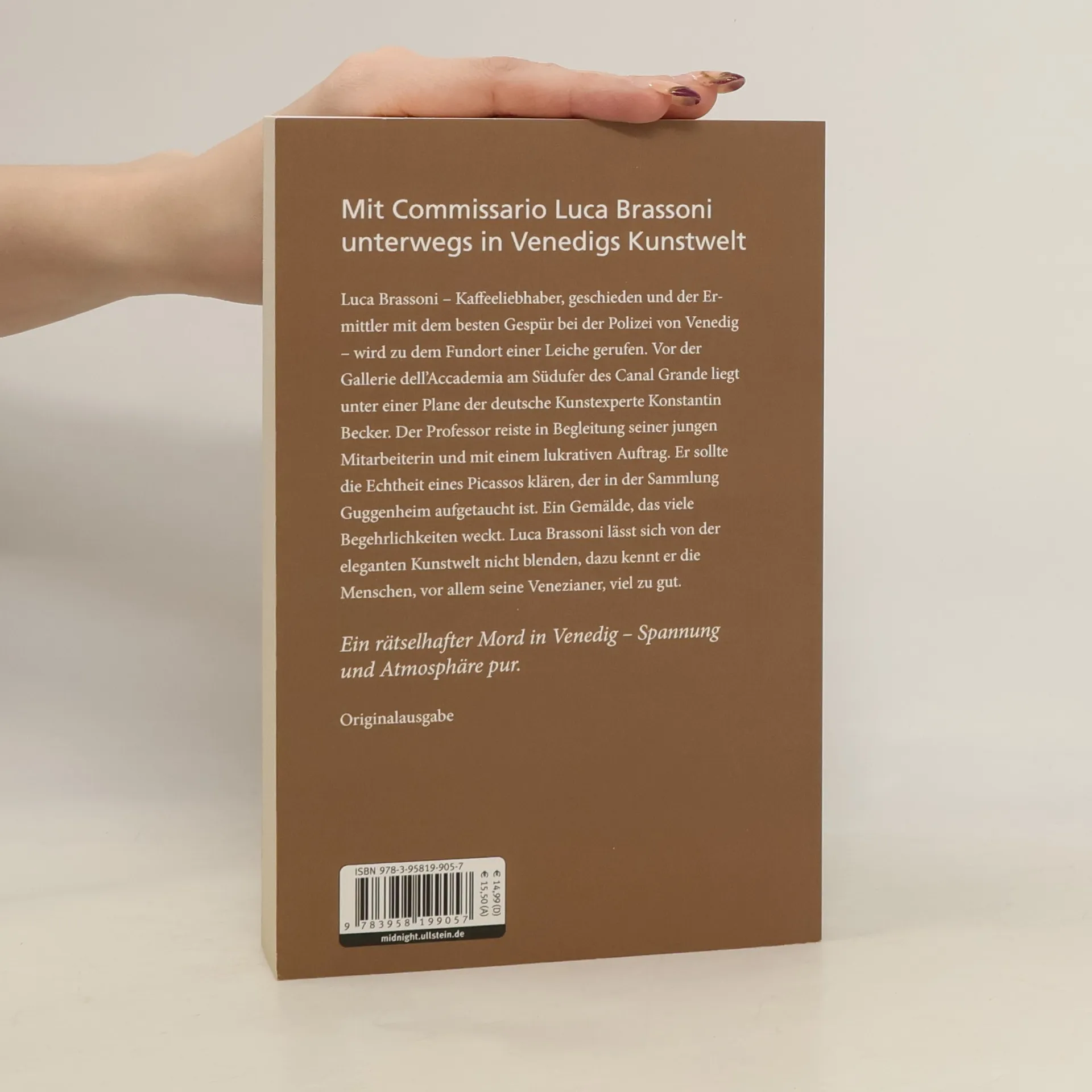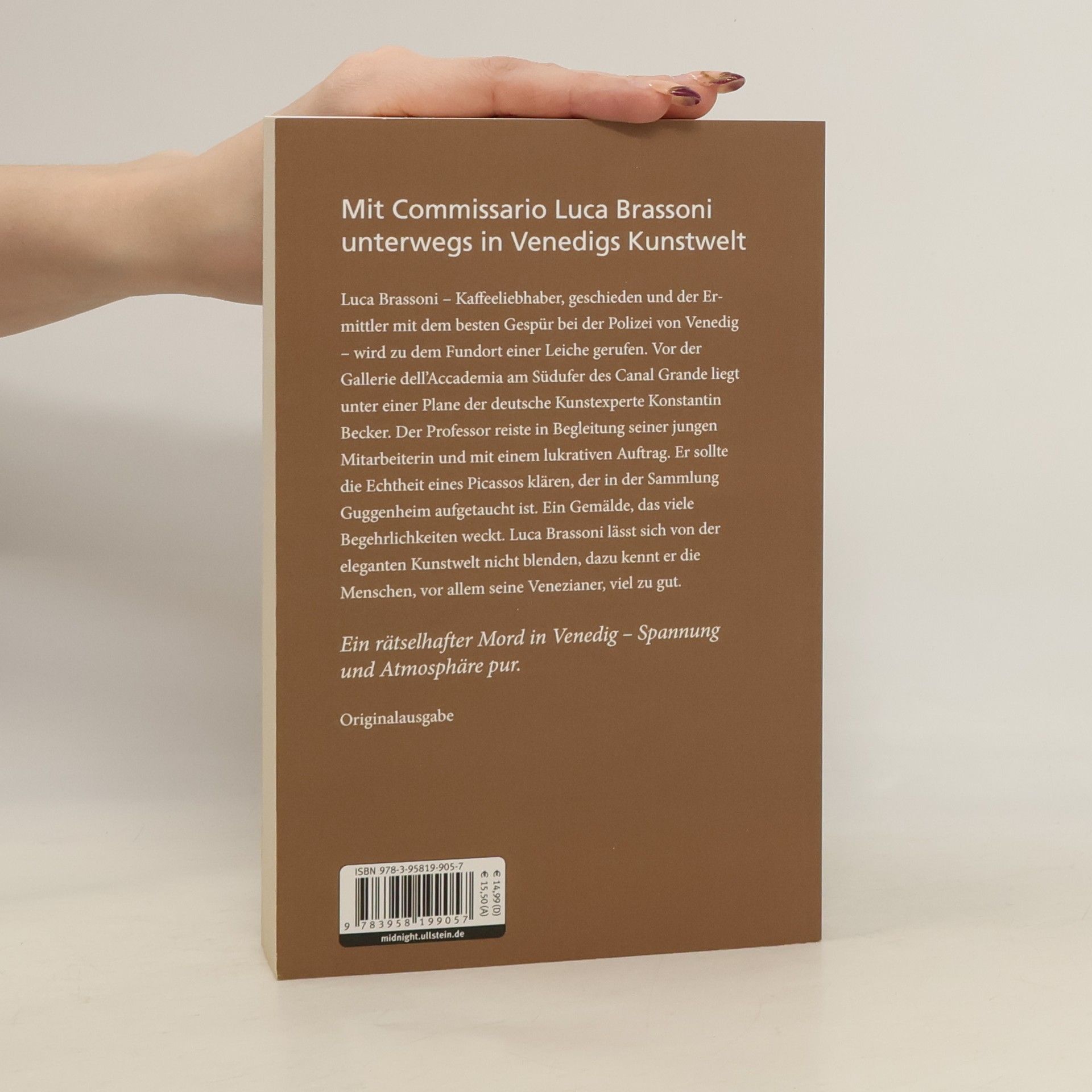 Luca Brassoni – Kaffeeliebhaber, geschieden und der Ermittler mit dem besten Gespür bei der Polizei von Venedig – wird zu dem Fundort einer Leiche gerufen. Vor der Gallerie dell’Accademia am Südufer des Canal Grande liegt unter einer Plane der deutsche Kunstexperte Konstantin Becker. Der Professor reiste in Begleitung seiner jungen Mitarbeiterin und mit einem lukrativen Auftrag. Er sollte die Echtheit eines Picassos klären, der in der Sammlung Guggenheim aufgetaucht ist. Ein Gemälde, das viele Begehrlichkeiten weckt. Luca Brassoni lässt sich von der eleganten Kunstwelt nicht blenden, dazu kennt er die Menschen, vor allem seine Venezianer, viel zu gut.
