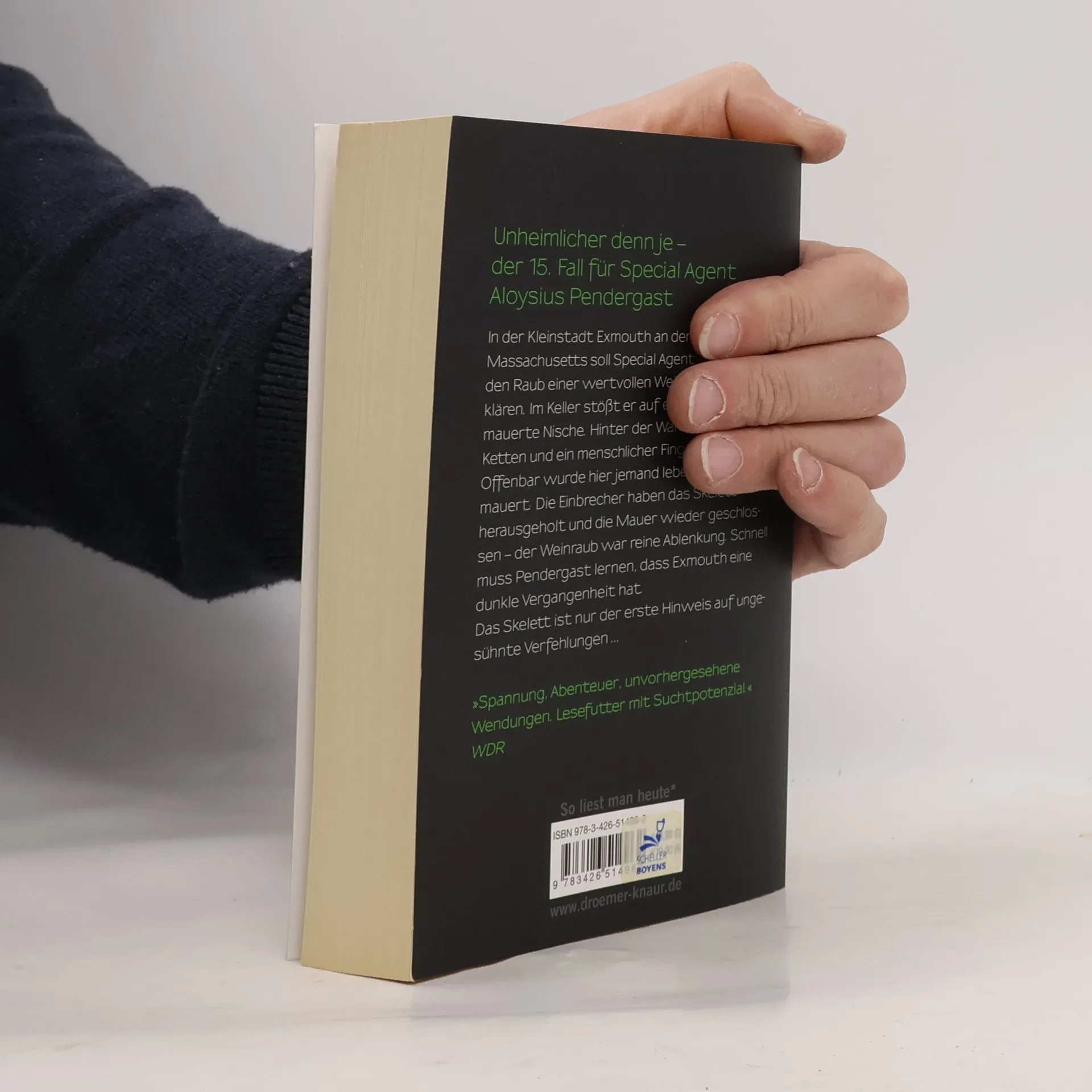 Eine geheime Gruft, ein mysteriöser Schiffbruch und ein Mord in den Salzmarschen - der 15. Fall für Special Agent Aloysius Pendergast In der Kleinstadt Exmouth an der Küste von Massachusetts soll Special Agent Pendergast den Raub einer wertvollen Weinsammlung aufklären. Im Weinkeller stößt er überraschend auf eine frisch zugemauerte Nische. Hinter der Wand sind Ketten zu finden, außerdem ein menschlicher Fingerknochen. Offenbar wurde hier vor langer Zeit jemand lebendig eingemauert. Die Einbrecher haben das Verlies geöffnet, das Skelett herausgeholt und die Mauer wieder geschlossen – der Weinraub war anscheinend reine Ablenkung. Schnell muss Pendergast lernen, dass Exmouth eine äußerst dunkle Vergangenheit hat. Das Skelett ist nur der erste Hinweis auf eine Verfehlung aus alter Zeit, die bis heute ungesühnt ist. „Spannung Abenteuer, unvorhergesehene Wendungen: Lesefutter mit Suchtpotential.“ WDR