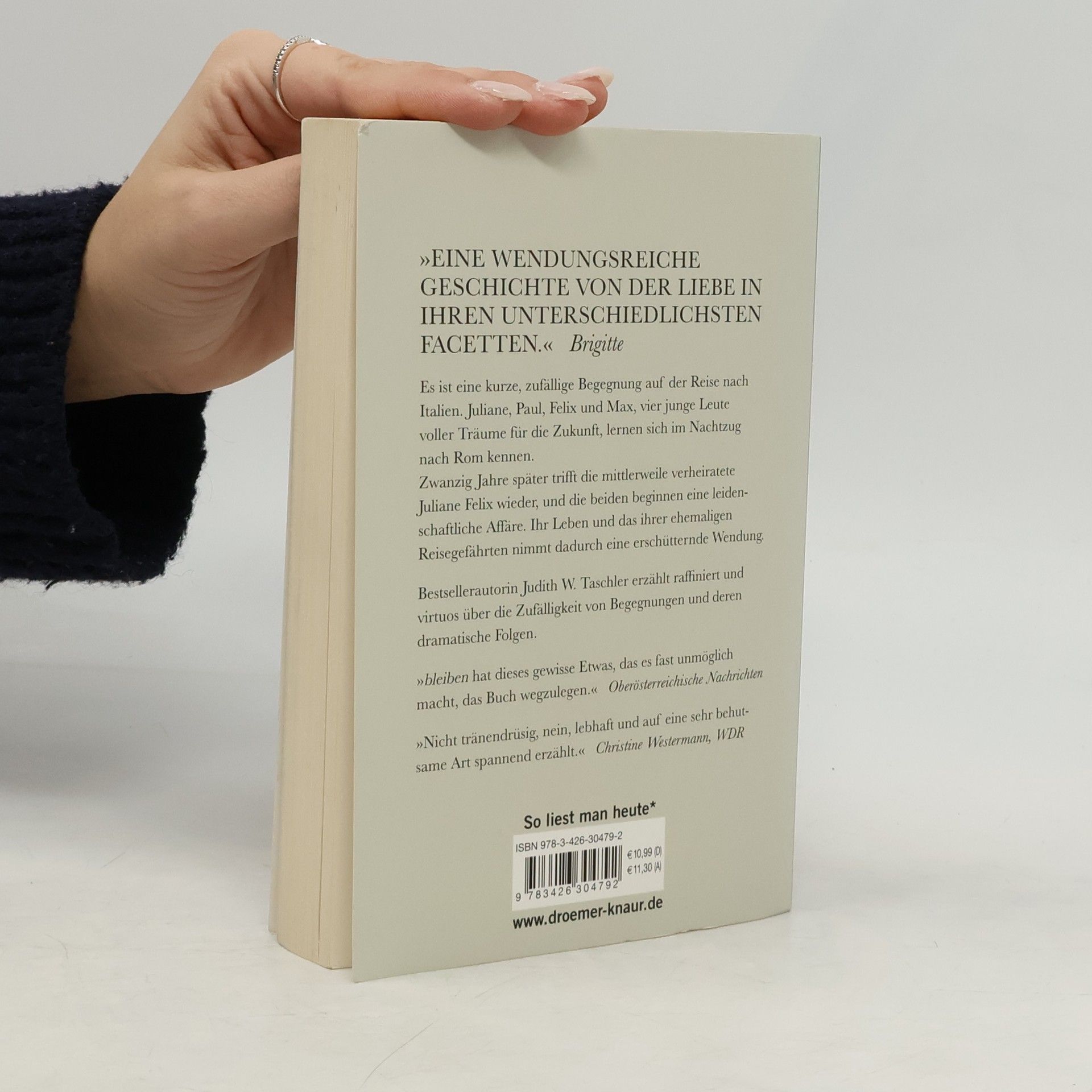 Mit „Die Deutschlehrerin“ gewann Bestseller-Autorin Judith W. Taschler den renommierten Friedrich Glauser-Preis. „Lebhaft und auf eine behutsame Art spannend erzählt“, urteilt Christine Westermann (WDR), über „bleiben“, den neuen Roman der Innsbrucker Autorin, in dem ihr abermals das Kunstwerk gelingt, literarisches Niveau mit klarer, unverwechselbarer Sprache zu verbinden. Eindrucksvoll schreibt sie über die großen Themen im Leben, wie Liebe und Verrat, Beziehungen und Betrug, Tod und Vertrauen. Es ist eine kurze, zufällige Begegnung auf der Reise nach Italien: Max, Paul, Felix und Juliane – vier junge Leute, voller Träume für die Zukunft, treffen im Nachtzug nach Rom aufeinander.Juliane und Paul werden heiraten, Max und Felix sich auf eine Weltreise begeben.Nach zwanzig Jahren trifft Juliane Felix zufällig in einer Galerie wieder und die beiden beginnen eine leidenschaftliche Affäre, die er jedoch ohne jede Erklärung abbricht. Juliane fühlt sich grenzenlos in ihrer Liebe gekränkt. Erst Monate später erfährt Juliane - ausgerechnet von ihrem Mann -, warum Felix die Affäre beenden wollte.Die Wahrheit ist furchtbar und lässt das Leben aller eine dramatische Wendung nehmen.