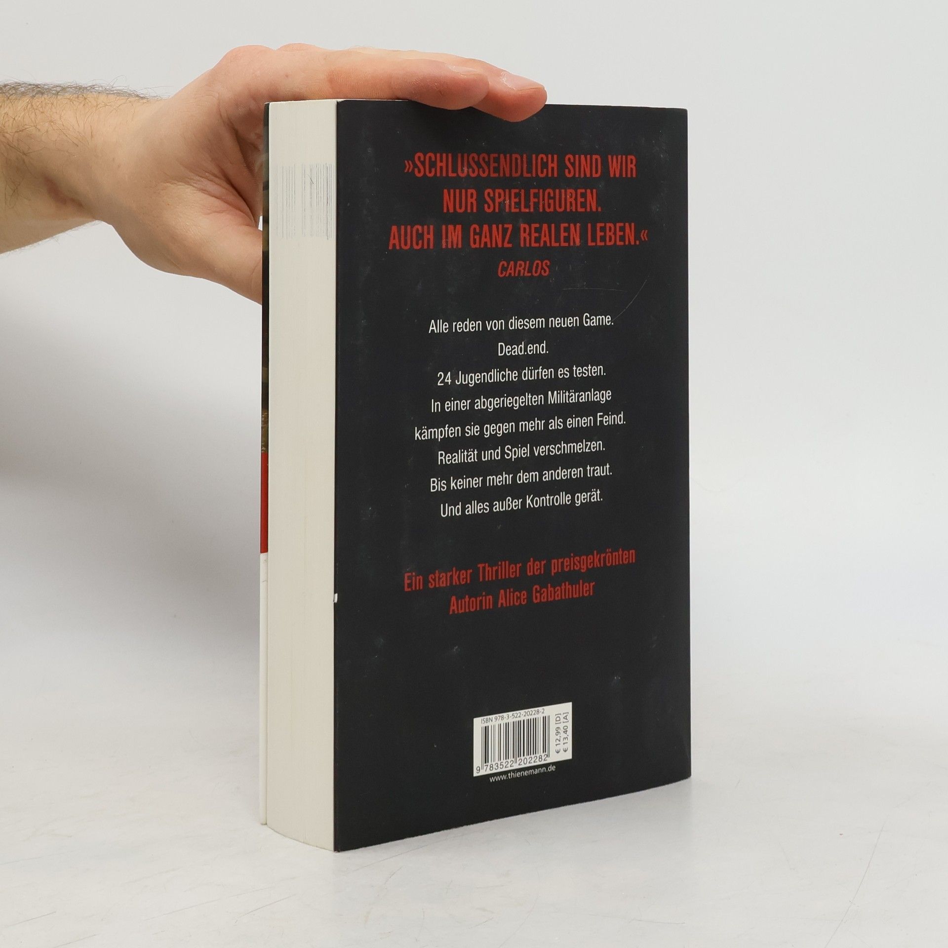 „Schlussendlich sind wir nur Spielfiguren. Auch im ganz realen Leben.“ Alle reden von diesem neuen Game. dead. end. 24 Jugendliche dürfen es testen. In einer abgeriegelten Militäranlage kämpfen sie gegen mehr als einen Feind. Realität und Spiel verschmelzen. Bis keiner mehr dem anderen traut. Und alles außer Kontrolle gerät. Ein starker Thriller der preisgekrönten Autorin Alice Gabathuler
