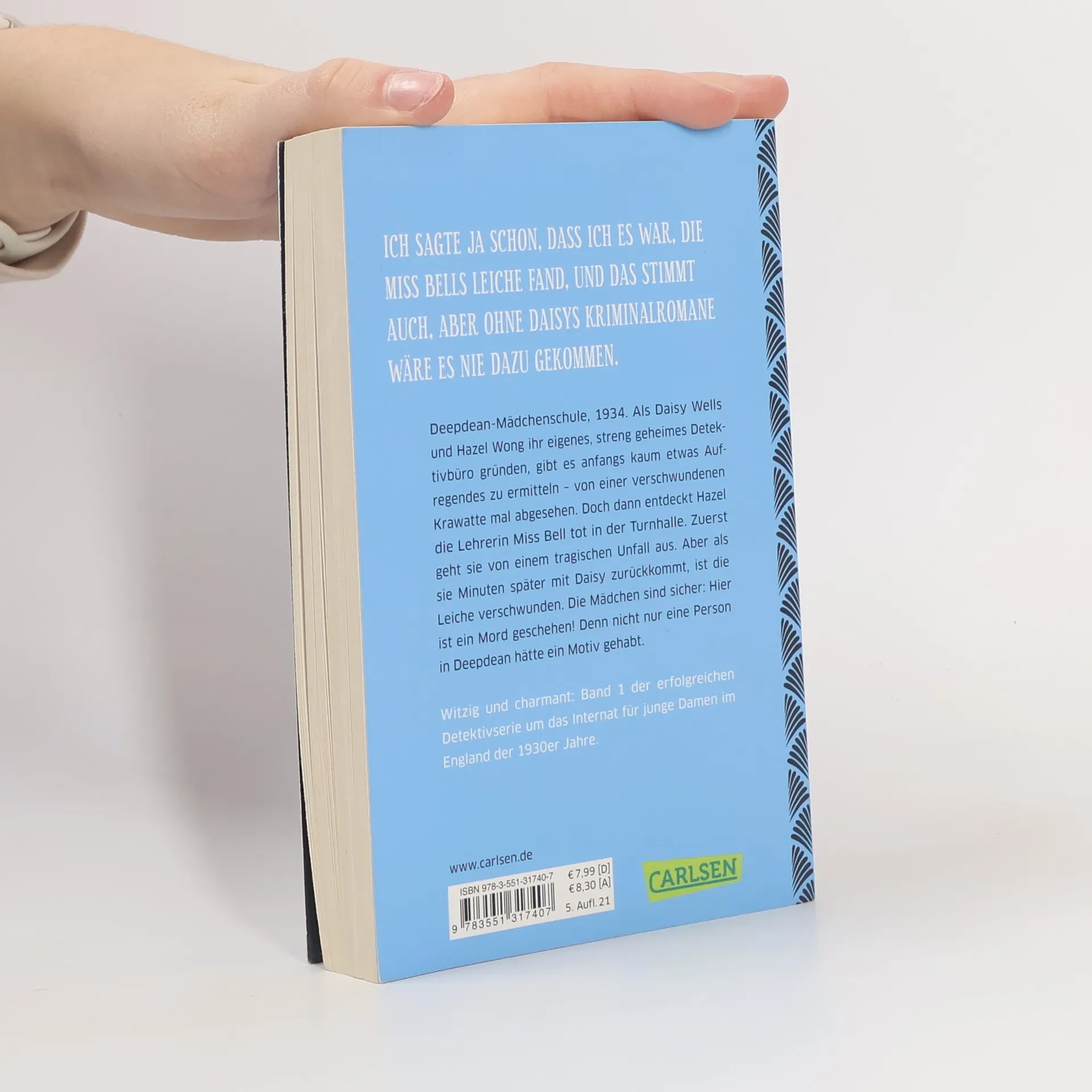 Deepdean-Mädchenschule, 1934. Als Daisy Wells und Hazel Wong ihr eigenes, streng geheimes Detektivbüro gründen, gibt es zuerst gar kein wirklich aufregendes Verbrechen zum Ermitteln. Doch dann entdeckt Hazel die Lehrerin Miss Bell tot in der Turnhalle. Zuerst denkt sie, es sei ein schrecklicher Unfall gewesen. Aber als Daisy und sie fünf Minuten später zurückkommen, ist die Leiche verschwunden. Jetzt sind die Mädchen sicher: Hier ist ein Mord geschehen! Und nicht nur eine Person in Deepdean hätte ein Motiv gehabt. --- Spannend, komisch, ungewöhnlich: Band 1 der Krimi-Serie „Ein Fall für Wells & Wong“ ---