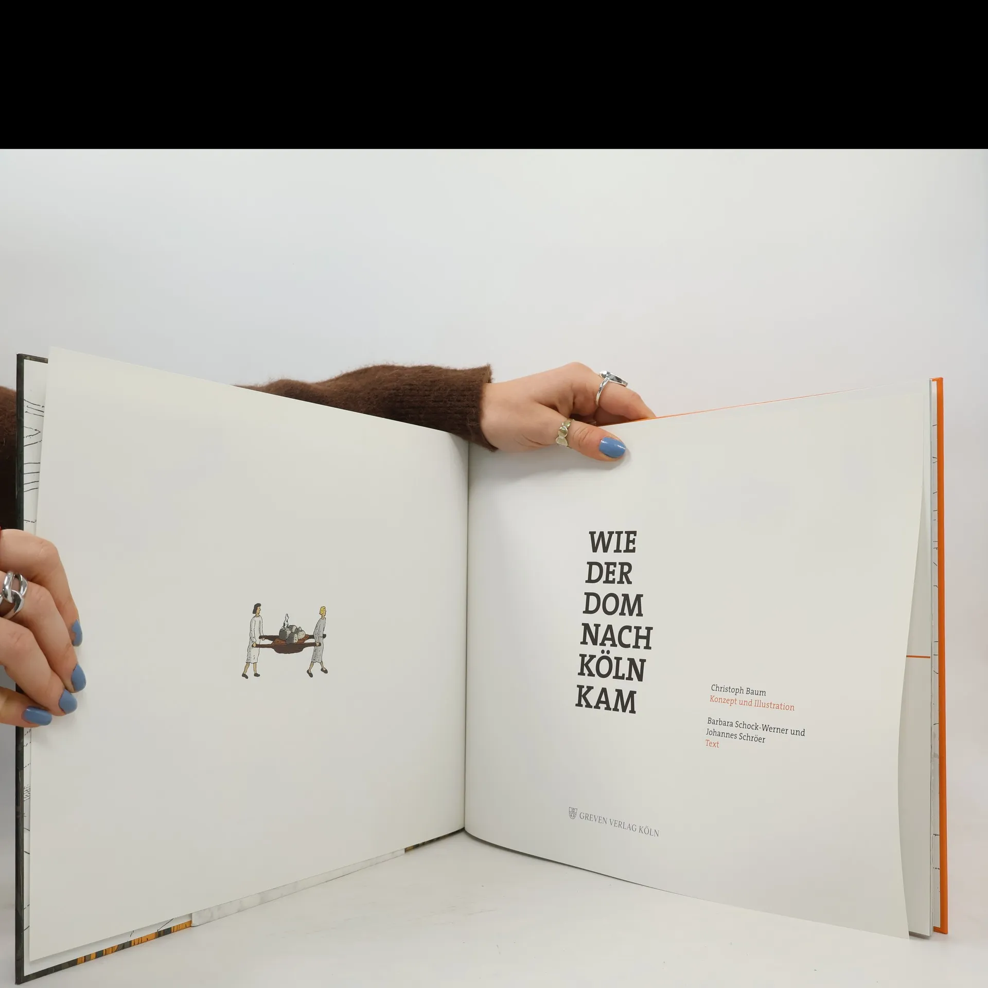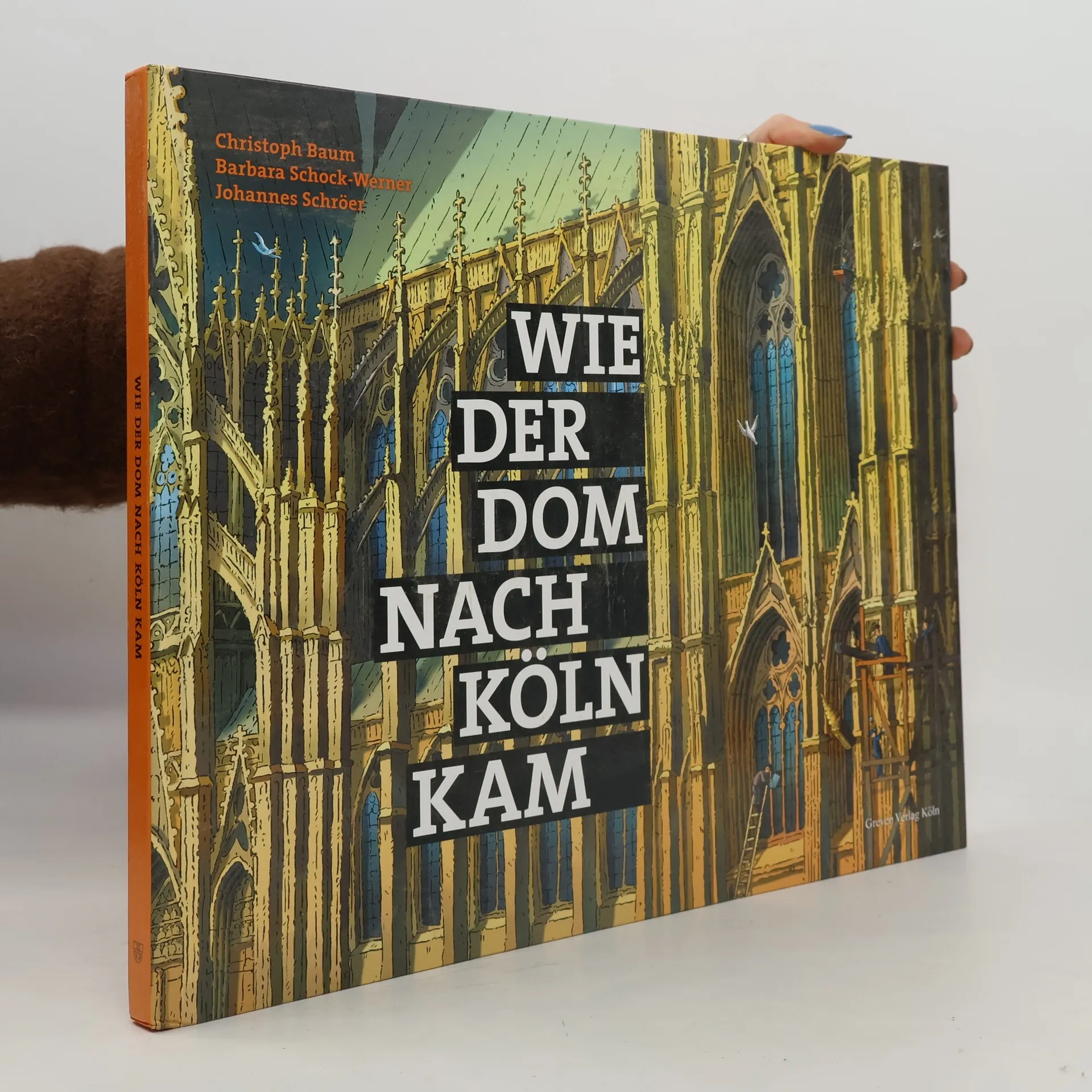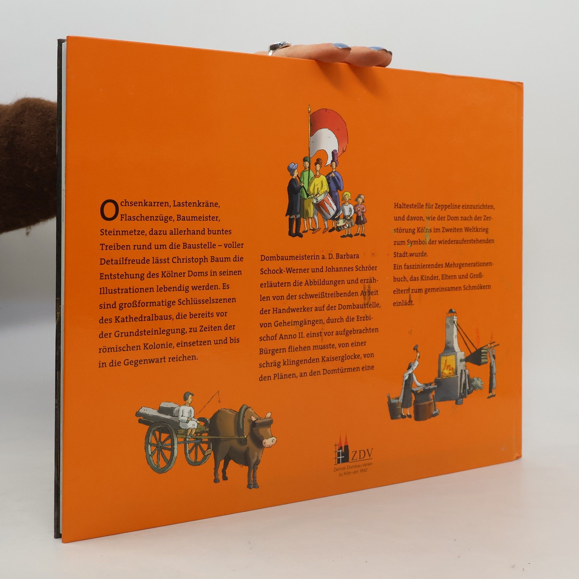 Vom Grundstein zur Kreuzblume - Die Kathedrale neu entdecken. Ochsenkarren, Lastenkräne, Flaschenzüge, Baumeister, Steinmetze, dazu allerhand buntes Treiben rund um die Baustelle – voller Detailfreude lässt Christoph Baum die Entstehung des Kölner Doms in seinen Illustrationen lebendig werden. Es sind großformatige Schlüsselszenen des Kathedralbaus, die bereits vor der Grundsteinlegung, zu Zeiten der römischen Kolonie einsetzen und bis in die Gegenwart reichen. Dombaumeisterin a. D. Barbara Schock-Werner und Johannes Schröer erläutern die Abbildungen und erzählen von der schweißtreibenden Arbeit der Handwerker auf der Dombaustelle, von Geheimgängen, durch die Erzbischof Anno II. einst vor aufgebrachten Bürgern fliehen musste, von einer schräg klingenden Kaiserglocke, von den Plänen, an den Domtürmen eine Haltestelle für Zeppeline einzurichten, und davon, wie der Dom nach der Zerstörung Kölns im Zweiten Weltkrieg zum Symbol der wiederauferstehenden Stadt wurde. Ein faszinierendes Mehrgenerationenbuch, das Kinder, Eltern und Großeltern zum gemeinsamen Schmökern einlädt. Gefördert von der Stiftung Kulturwerk der VG BILD-KUNST, Bonn