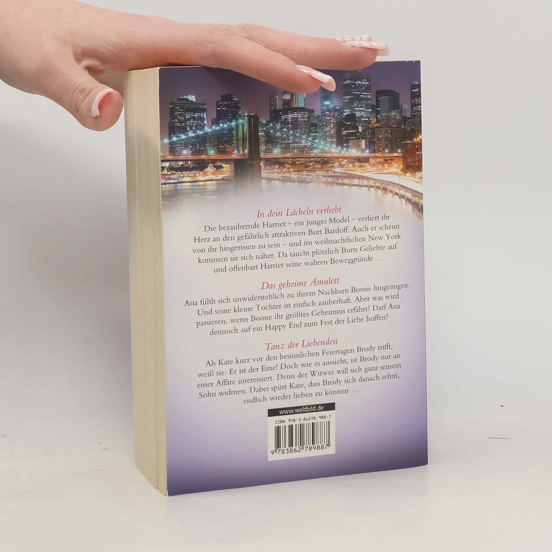 In dein Lächeln verliebtDie bezaubernde Harriet - ein junges Model - verliert ihr Herz an den gefährlich attraktiven Burt Bardoff. Auch er scheint von ihr hingerissen zu sein - und im weihnachtlichen New York kommen sie sich näher. Da taucht plötzlich Burts Geliebte auf und offenbart Harriet seine wahren Beweggründe...Das geheime AmulettAna fühlt sich unwiderstehlich zu ihrem Nachbarn Boone hingezogen. Und seine kleine Tochter ist einfach zauberhaft. Aber was wird passieren, wenn Boone ihr größtes Geheimnis erfährt? Darf Ana dennoch auf ein Happy End zum Fest der Liebe hoffen?Tanz der LiebendenAls Kate kurz vor den besinnlichen Feiertagen Brody trifft, weiß sie: Er ist der Eine! Doch wie es aussieht, ist Brody nur an einer Affäre interessiert. Denn der Witwer will sich ganz seinem Sohn widmen. Dabei spürt Kate, dass Brody sich danach sehnt endlich wieder lieben zu können...