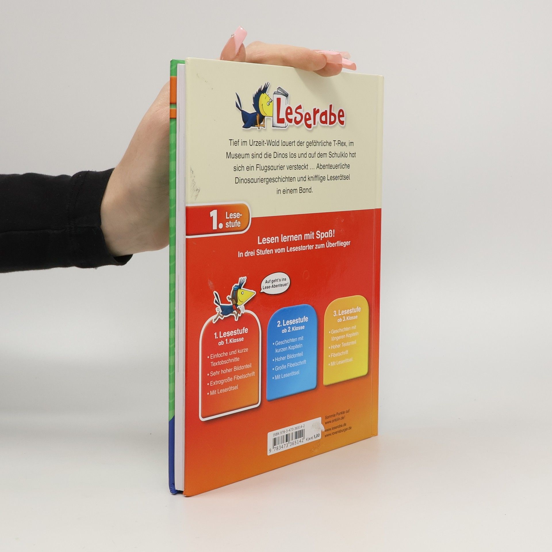Tief im Urzeit-Wald lauert der gefährliche T-Rex, im Museum sind die Dinos los und auf dem Schulklo hat sich ein Flugsaurier versteckt ... Lesen lernen wie im Flug! Die Kinderbücher der Reihe Leserabe – 1. Lesestufe wurden mit Pädagogen entwickelt und richten sich an Leseanfänger ab der 1. Klasse. Kurze Texte in großer Fibelschrift sichern erste Leseerfolge und steigern die Lesekompetenz von Mädchen und Jungen ab 6 Jahren. Empfohlen von Stiftung Lesen, gelistet bei Antolin.