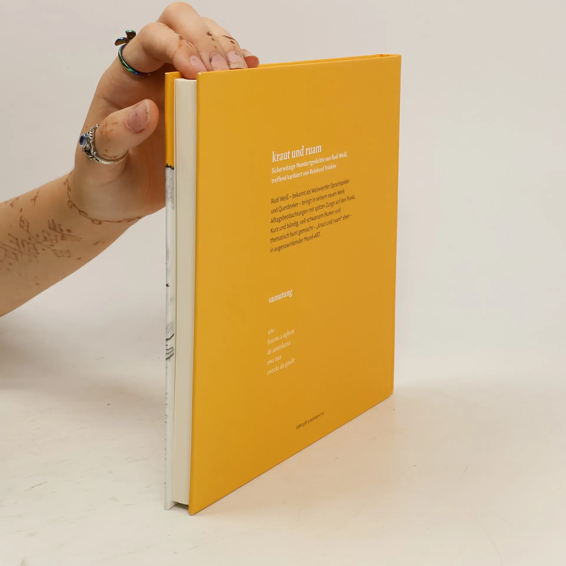 kraut und ruam Sickerwitzige Mundartgedichte von Rudi Weiß, treffend karikiert von Reinhard Trinkler Rudi Weiß – bekannt als Weinviertler Sprachspieler und Querdenker – bringt in seinem neuen Werk Alltagsbeobachtungen mit spitzer Zunge auf den Punkt. Kurz und bündig, voll schwarzem Humor und thematisch bunt gemischt – „kraut und ruam“ eben – in augenzwinkender Mund-ART.