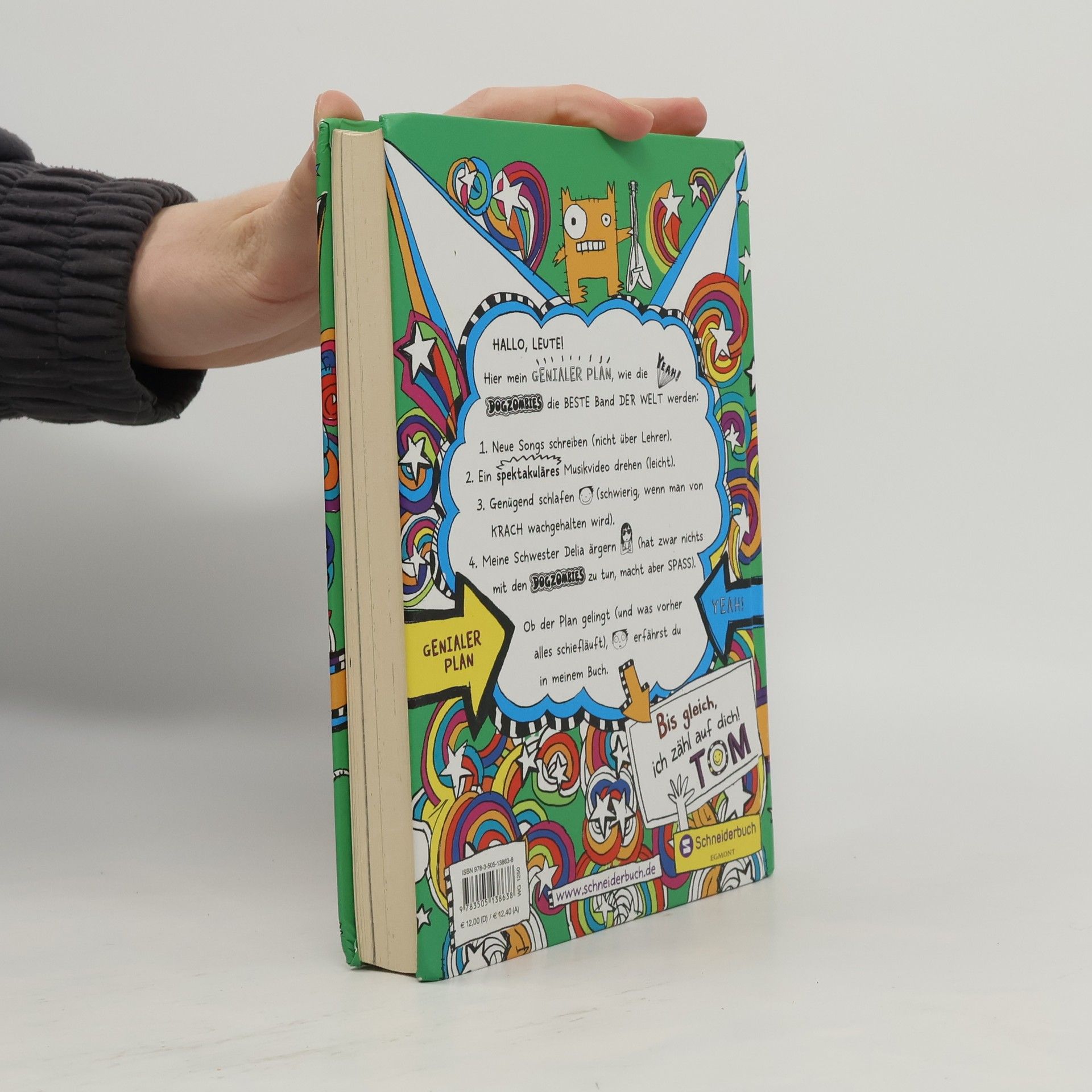 HALLO, LEUTE! Das ist mein GENIALER PLAN, um aus den DogZombies die BESTE Band DER WELT zu machen: 1. Neue Songs schreiben (nicht über Lehrer). 2. Ein spektakuläres Musikvideo drehen (leicht). 3. Genügend schlafen (schwierig, wenn man von KRACH wachgehalten wird). 4. Meine Schwester Delia ärgern (hat zwar nichts mit den DogZombies zu tun, macht aber SPASS). Ob der Plan gelingt (und was vorher alles schiefläuft), erfährst du in meinem Buch. Bis geich, ich zähl auf dich! TOM