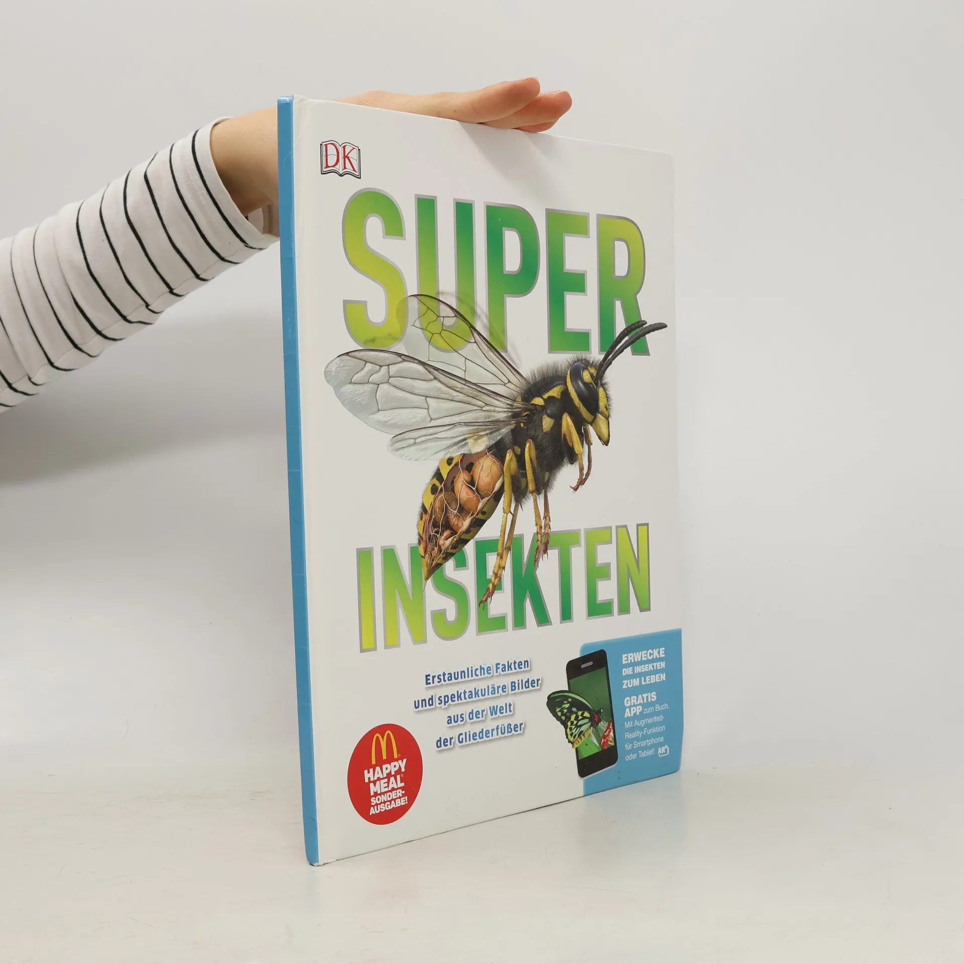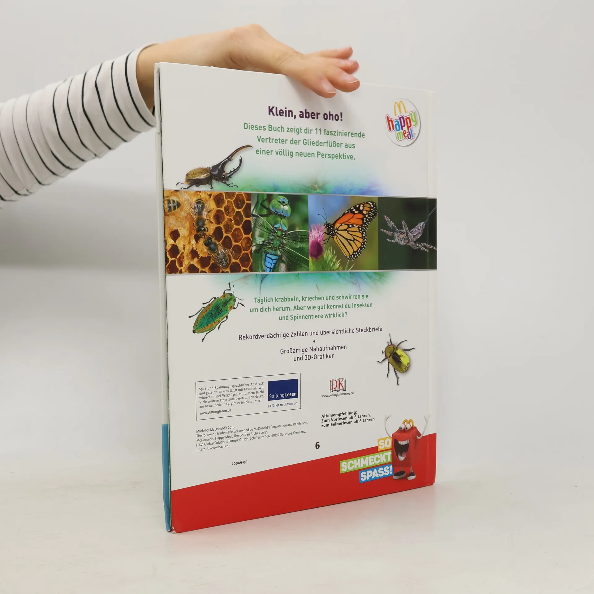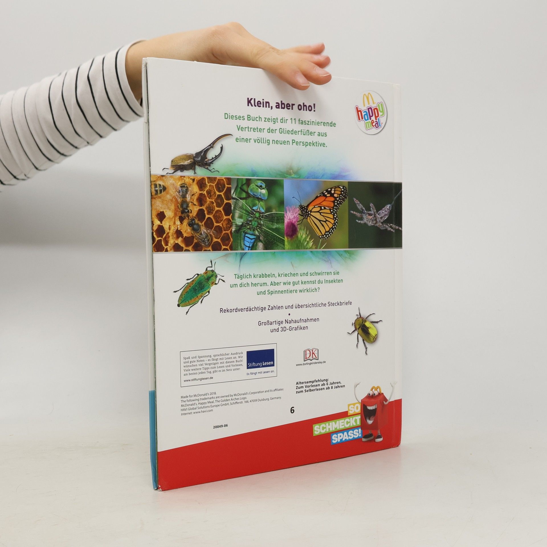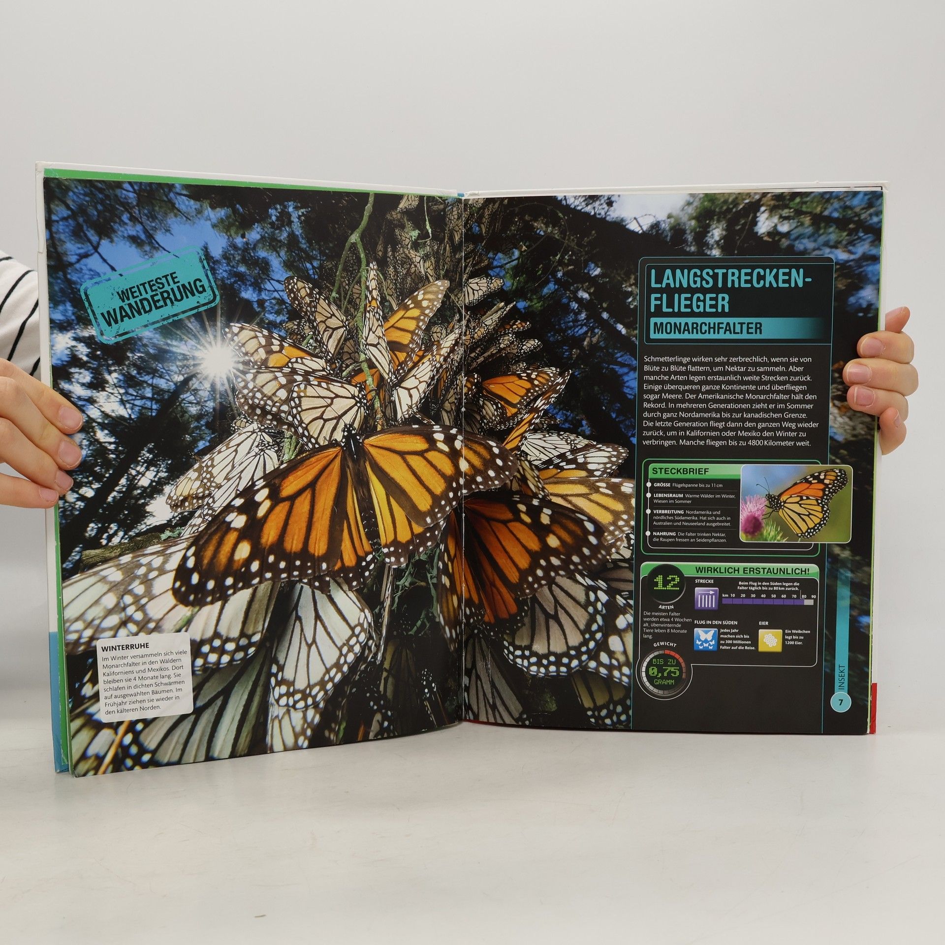 Kleine Tierchen ganz groß – in diesem Buch findet ihr alles was krabbelt, kriecht und herumschwirrt! Beeindruckende Makrofotografien in doppelseitigen Porträts zeigen über 100 Insekten ganz nah und enthüllen dabei ihre faszinierenden Fähigkeiten sowie ihr cleveres Jagdverhalten. In realistischen 3-D-Grafiken könnt ihr verblüffende anatomische Details und Besonderheiten von riesigen Vogelspinnen, vielbeinigen Tausendfüßern oder mikroskopisch kleinen Zwergwespen entdecken. Schaut genau hin, denn so detailliert habt ihr die interessanten Krabbeltierchen noch nie gesehen! Oder habt ihr zuvor schon mal in die riesigen dunklen Komplexaugen einer Libelle oder in das glühende Leuchtorgan eines Glühwürmchens geblickt? In ungewöhnlichen Rekorden und spannenden Forschungsdaten erfahrt ihr, dass ein Morphofalter eine Flügelspannweite von bis zu 20 cm erreichen und dass eine Wanderameisen-Kolonne bis zu 100m lang sein kann. Einfach unglaublich, oder? Dieses Buch ist bei Antolin.de verfügbar.