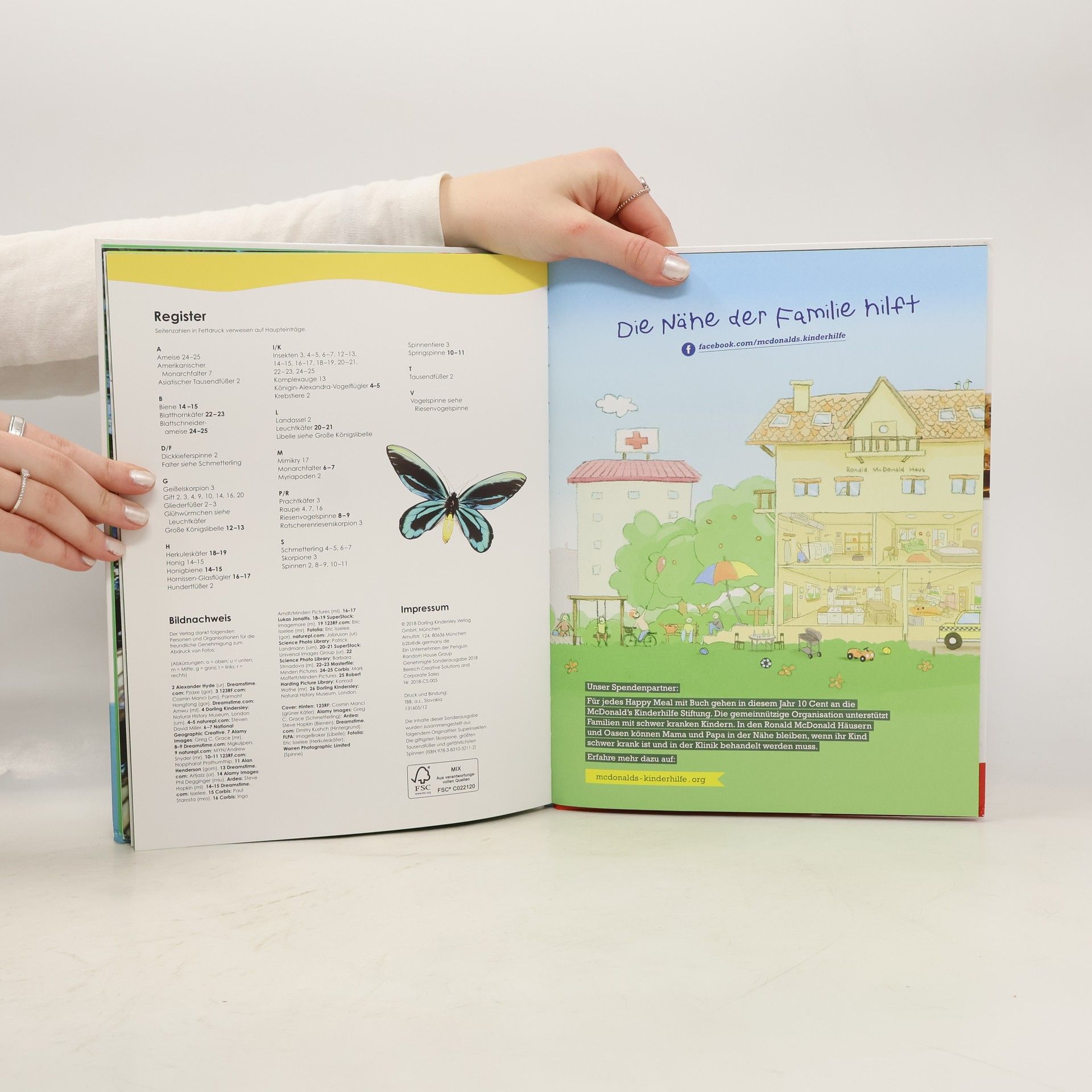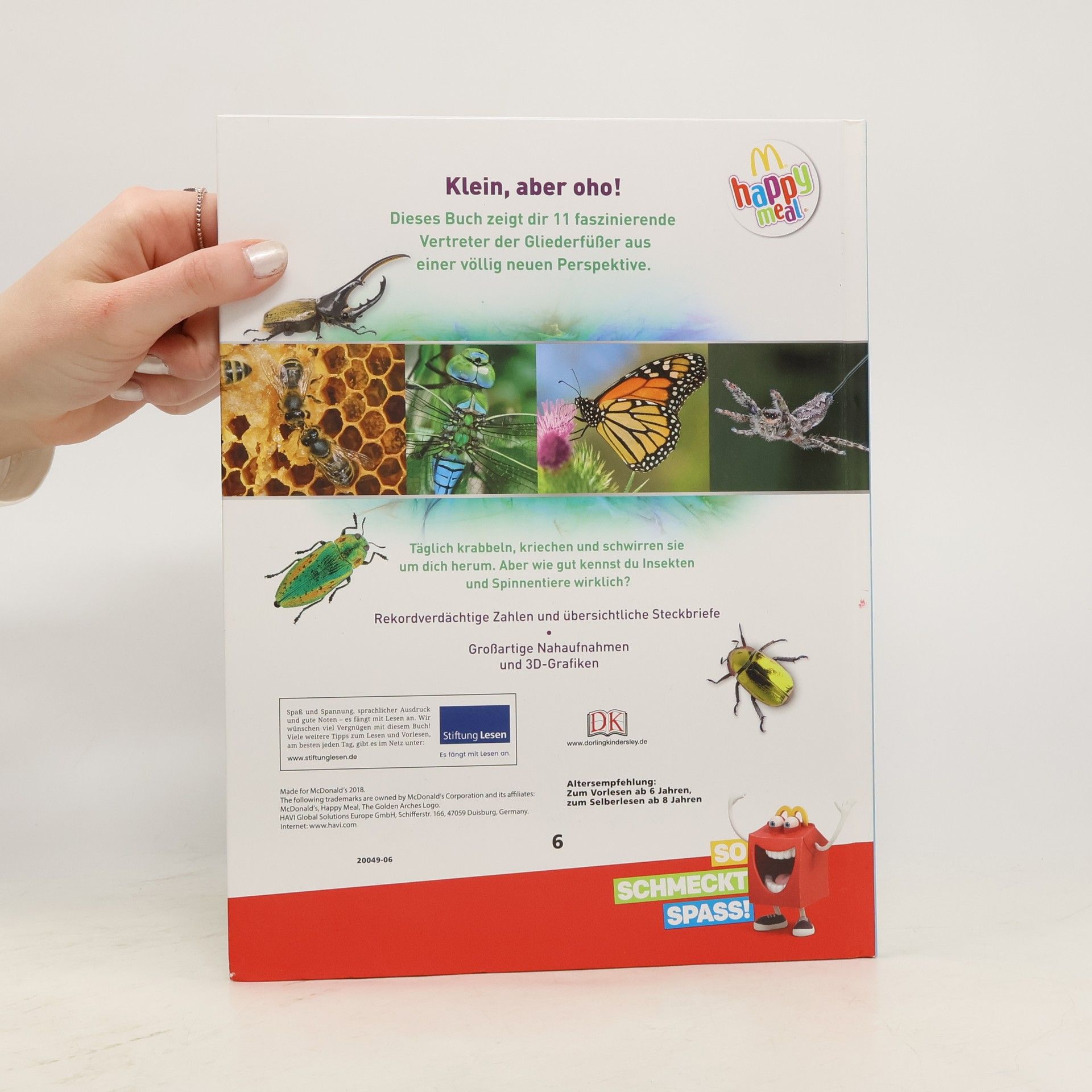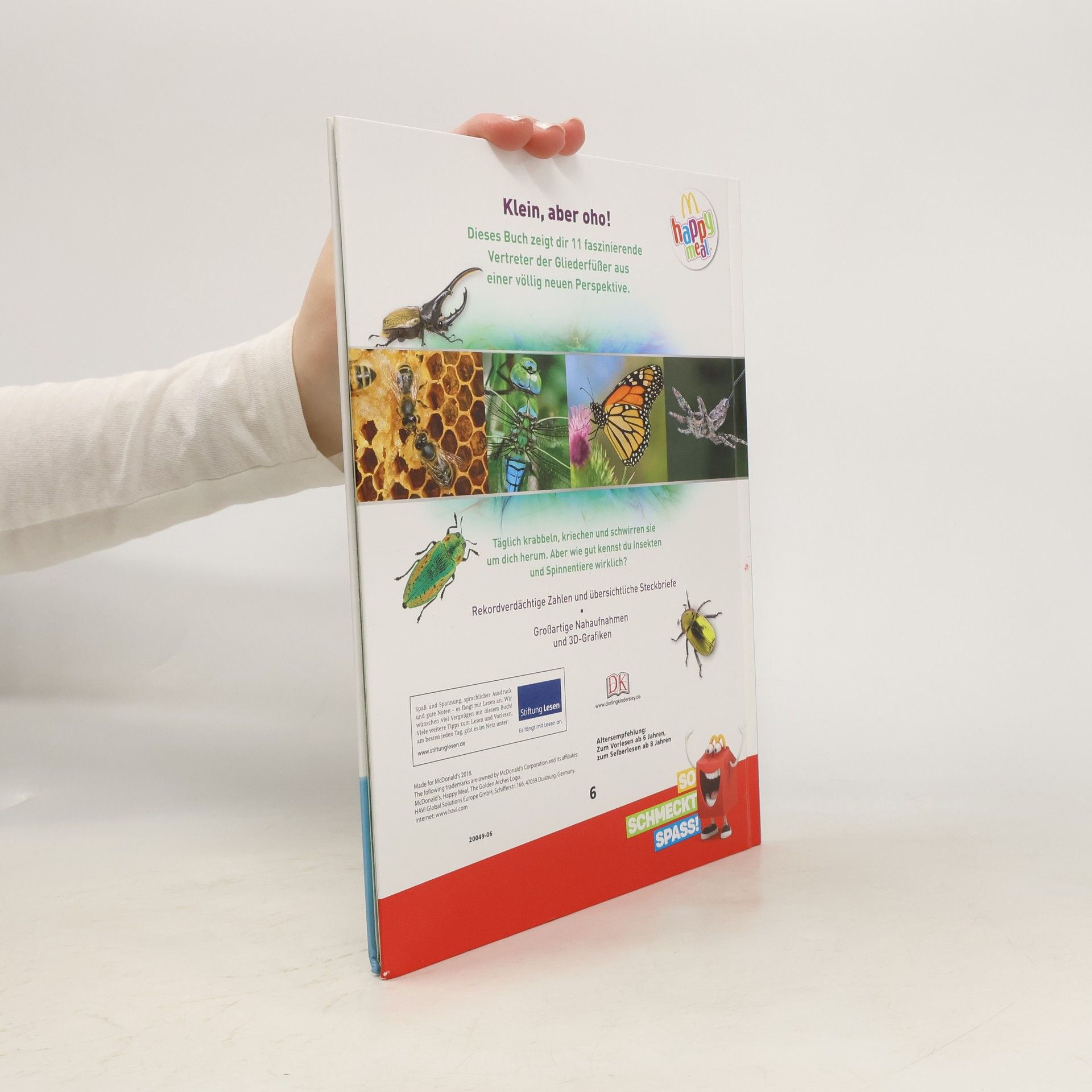 Kleine Tierchen ganz groß – in diesem Buch findet ihr alles was krabbelt, kriecht und herumschwirrt! Beeindruckende Makrofotografien in doppelseitigen Porträts zeigen über 100 Insekten ganz nah und enthüllen dabei ihre faszinierenden Fähigkeiten sowie ihr cleveres Jagdverhalten. In realistischen 3-D-Grafiken könnt ihr verblüffende anatomische Details und Besonderheiten von riesigen Vogelspinnen, vielbeinigen Tausendfüßern oder mikroskopisch kleinen Zwergwespen entdecken. Schaut genau hin, denn so detailliert habt ihr die interessanten Krabbeltierchen noch nie gesehen! Oder habt ihr zuvor schon mal in die riesigen dunklen Komplexaugen einer Libelle oder in das glühende Leuchtorgan eines Glühwürmchens geblickt? In ungewöhnlichen Rekorden und spannenden Forschungsdaten erfahrt ihr, dass ein Morphofalter eine Flügelspannweite von bis zu 20 cm erreichen und dass eine Wanderameisen-Kolonne bis zu 100m lang sein kann. Einfach unglaublich, oder? Dieses Buch ist bei Antolin.de verfügbar.