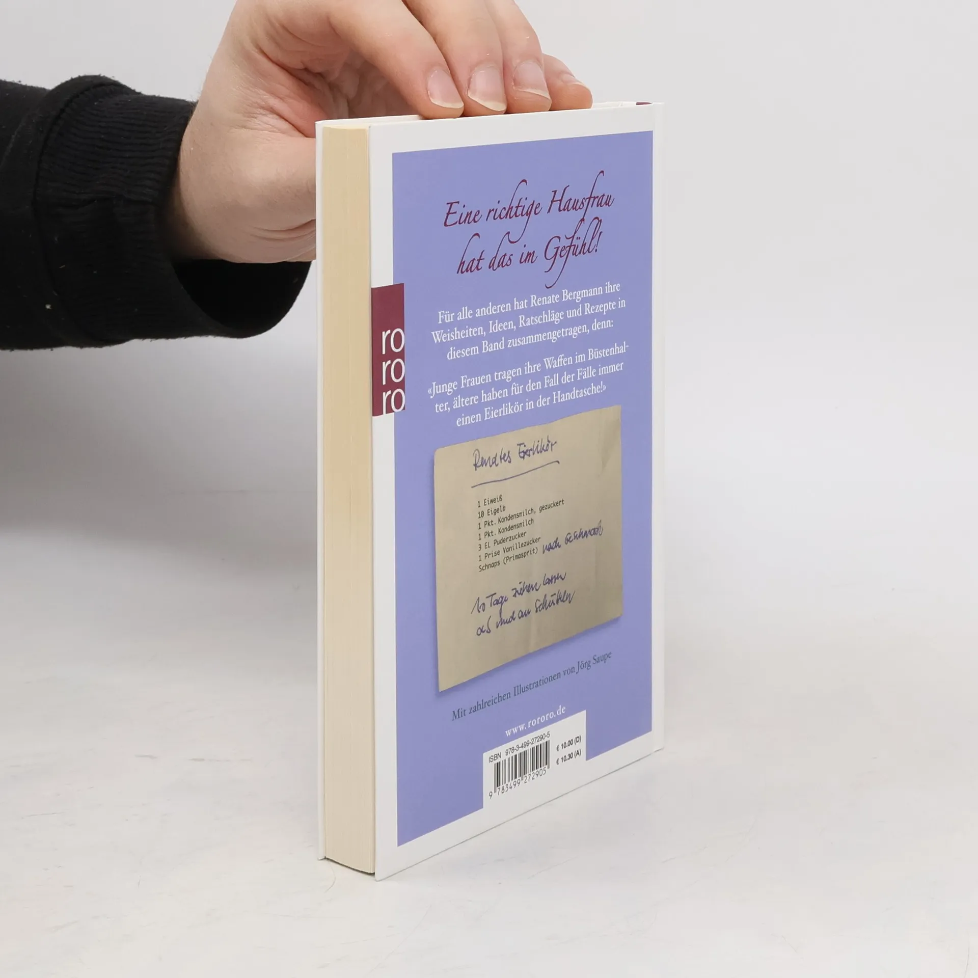 Eine richtige Hausfrau hat das im Gefühl! Für alle anderen hat Renate Bergmann hier ihre Weisheiten, Ideen, Ratschläge und Rezepte in diesem Band zusammengetragen, denn «Junge Frauen tragen ihre Waffen im Büstenhalter, ältere haben für den Fall der Fälle immer einen Eierlikör in der Handtasche!» Renates Eierlikör: 1 Eiweiß 10 Eigelb 1 Pkt. Kondensmilch, gezuckert 1 Pkt. Kondensmilch 3 EL Puderzucker 1 Prise Vanillezucker Schnaps (Primasprit) nach Geschmack 10 Tage ziehen lassen ab und an schütteln