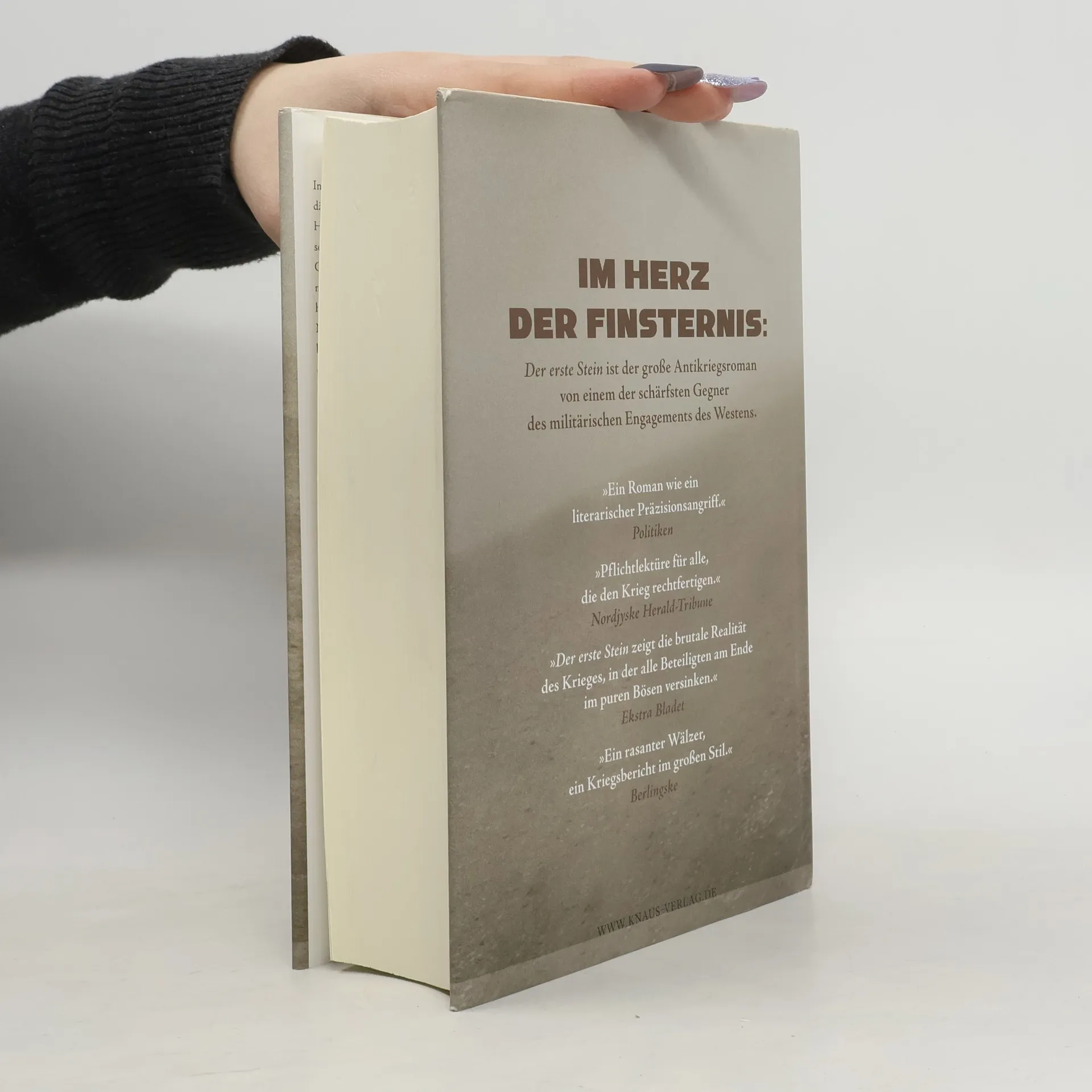 Im Herz der Finsternis – Der große Antikriegsroman von einem der schärfsten Gegner des militärischen Engagements des Westens in Afghanistan In einem Militärcamp in Afghanistan trifft ein Zug dänischer Soldaten ein, 24 Männer und die Soldatin Hannah unter Führung des charismatischen Rasmus Schrøder. Alle sind hochmotiviert, hervorragend ausgebildet und abenteuerhungrig. Doch die Tage fließen monoton dahin, bis durch eine Landmine zwei Männer sterben und eine sich immer schneller drehende Spirale der Gewalt in Gang setzt. Als schließlich Schrøder die Truppe verrät, gerät alles außer Kontrolle. „Der erste Stein“ ist ein großes Epos über Menschen in den Fängen des Krieges und über Freundschaft, Liebe, Verrat und den Tod.