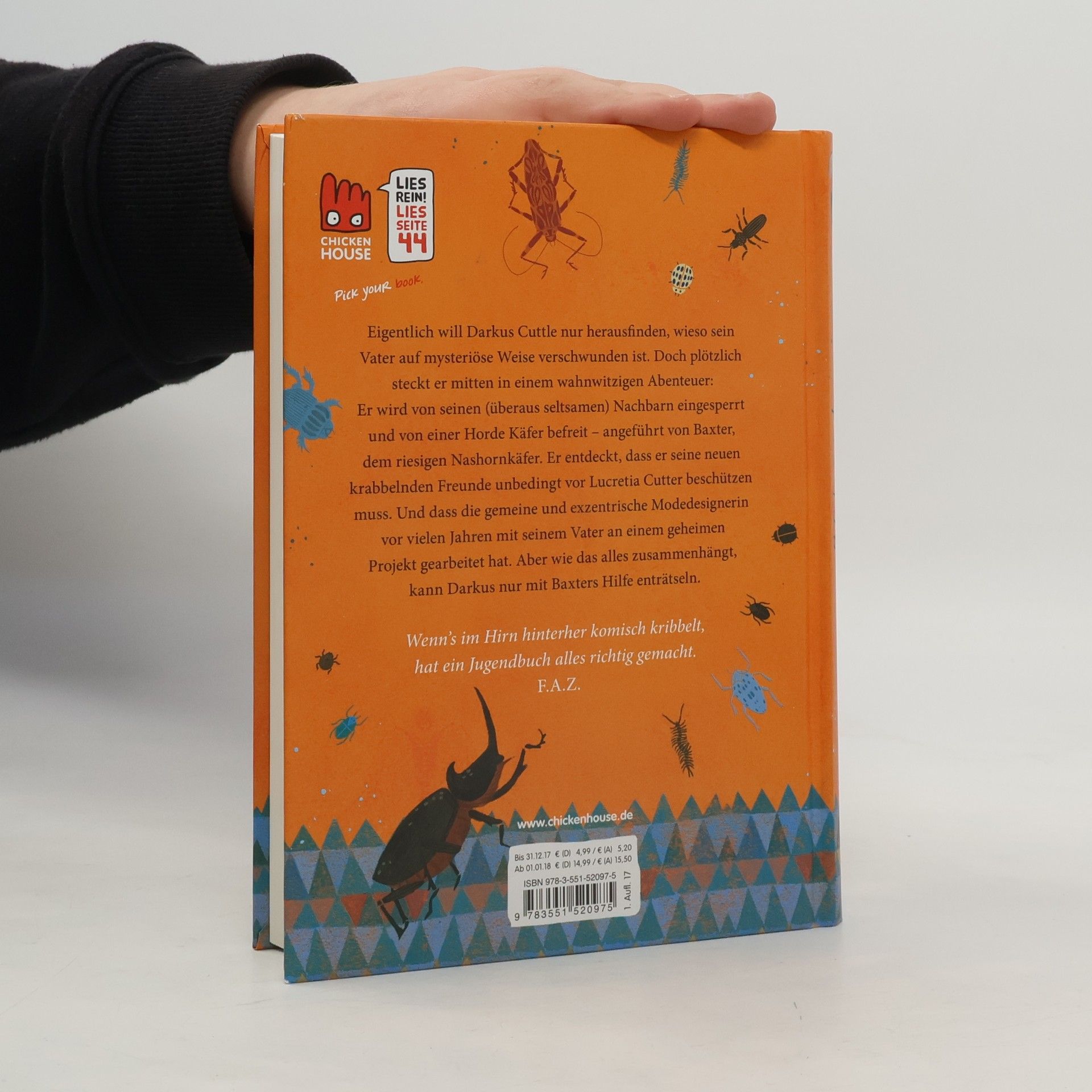 Eigentlich will Darkus Cuttle nur herausfinden, wieso sein Vater auf mysteriöse Weise verschwunden ist. Doch plötzlich steckt er mitten in einem wahnwitzigen Abenteuer: Er wird von seinen (überaus seltsamen) Nachbarn eingesperrt und von einer Horde Käfer befreit – angeführt von Baxter, dem riesigen Nashornkäfer. Er entdeckt, dass er seine neuen krabbelnden Freunde unbedingt vor Lucretia Cutter beschützen muss. Und dass die gemeine und exzentrische Modedesignerin vor vielen Jahren mit seinem Vater an einem geheimen Projekt gearbeitet hat. Aber wie das alles zusammenhängt, kann Darkus nur mit Baxters Hilfe enträtseln. Alle Bände der weltweit erfolgreichen Käfer-Saga: Käferkumpel (Band 1) Käfer-Queen (Band 2) Käferkrawall (Band 3)